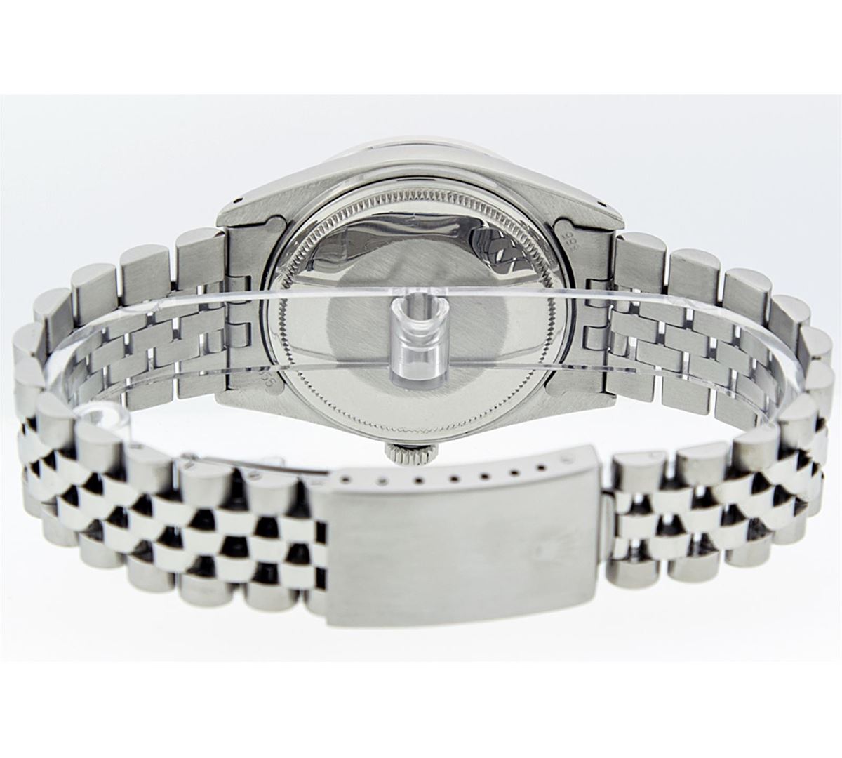 One Mens Rolex Datejust Polished, Serviced & Electronically Tested, Stainless Steel Case:36mm, Stainless Steel Crown, Custom Bezel: 18K White Beadset Diamond Bezel, Diamond Count: 44 Diamonds . Total Weight 1.00 Carat, Clarity: SI-VS, Color: G to H. Custom Crystal: Synthetic Sapphire Cyclops Lens. Movement: Automatic Winding Movement Caliber 3035. Custom Dial: Slate Grey With Diamond Hour Markers, 10 Diamond Dial. G To H In Color, Clarity: SI-VS. Date Window: 3 O'Clock Position Date Display, Quickset, Model: Datejust. Condition: G-6 Extra Fine. Bracelet: Stainless Steel Jubilee. Bright Polish & Satin Finish. 7.0 Inch Length, Adjustable. Standard Clasp, With Rolex Logo. Comes with 6 month warranty.