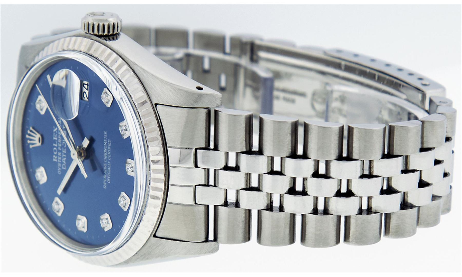 One Gents Rolex Datejust Polished, Serviced & Electronically Tested, Stainless Steel Case:36mm, Stainless Steel Crown, Bezel: 18K White Gold Fluted Bezel. Custom Crystal: Acrylic Cyclops Lens. Movement: Automatic Winding Movement Caliber 3035. Custom Dial: Blue Dial With Diamond Hour Markers And Line Track, Diamond Count: 10 Diamonds, Clarity: SI-VS, Color: G To H. Date Window: 3 O'Clock Position Date Display, Quickset, Model: Datejust Condition: G-6 Extra Fine. Bracelet: Stainless Steel Jubilee. Bright Polish & Satin Finish. 7 Inch Length, Adjustable. Standard Clasp, With Rolex Logo.