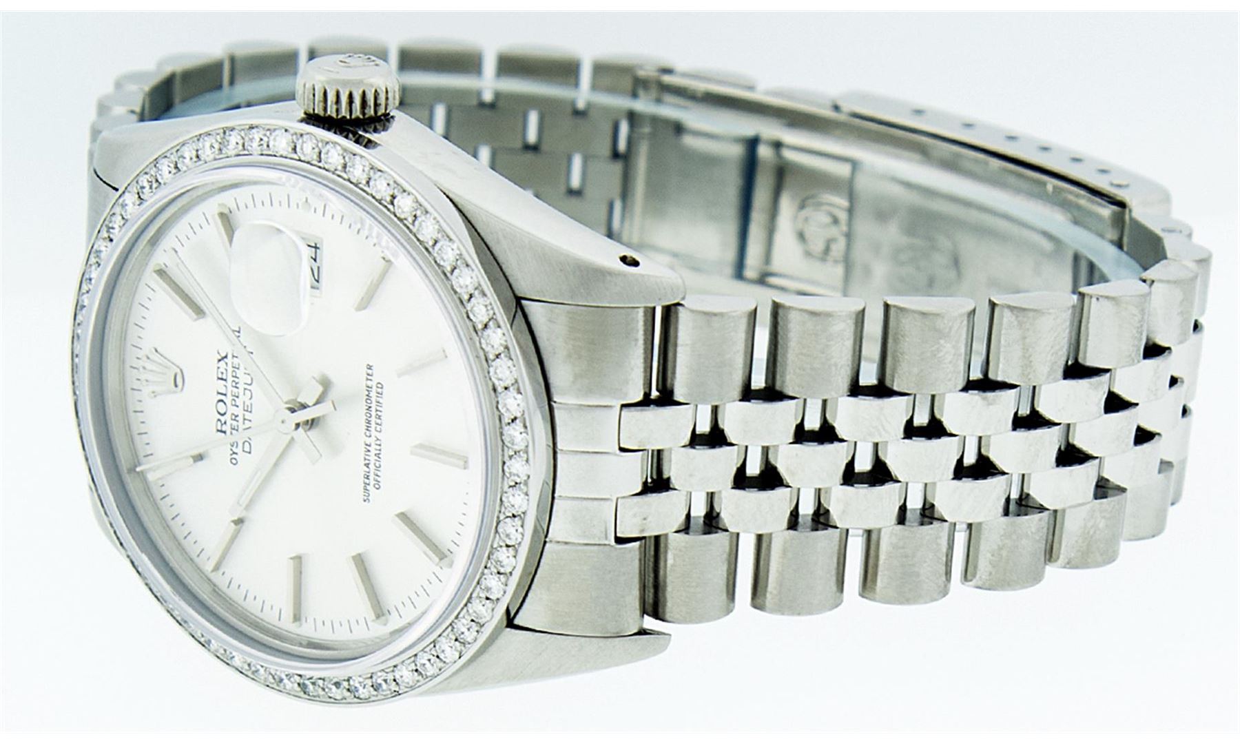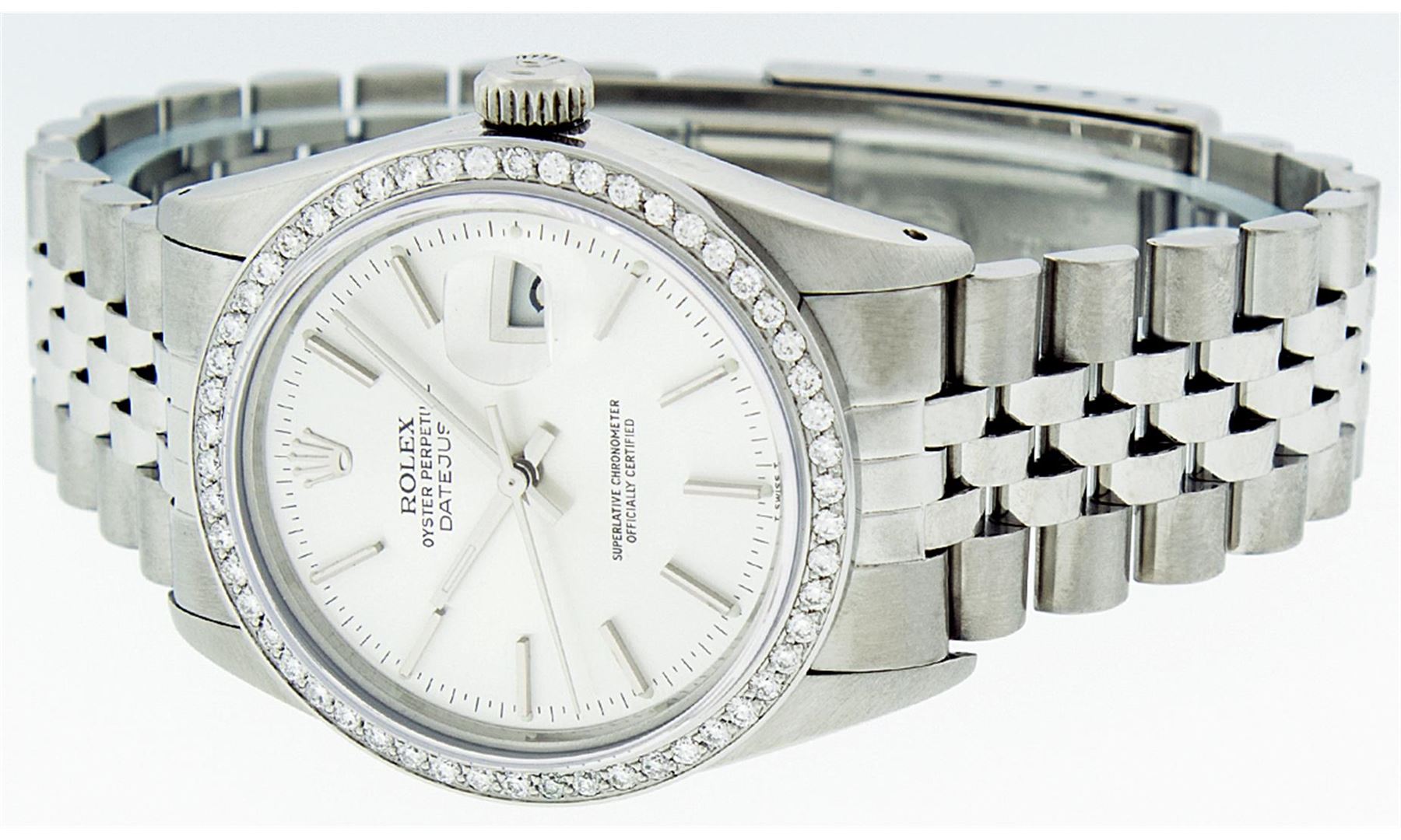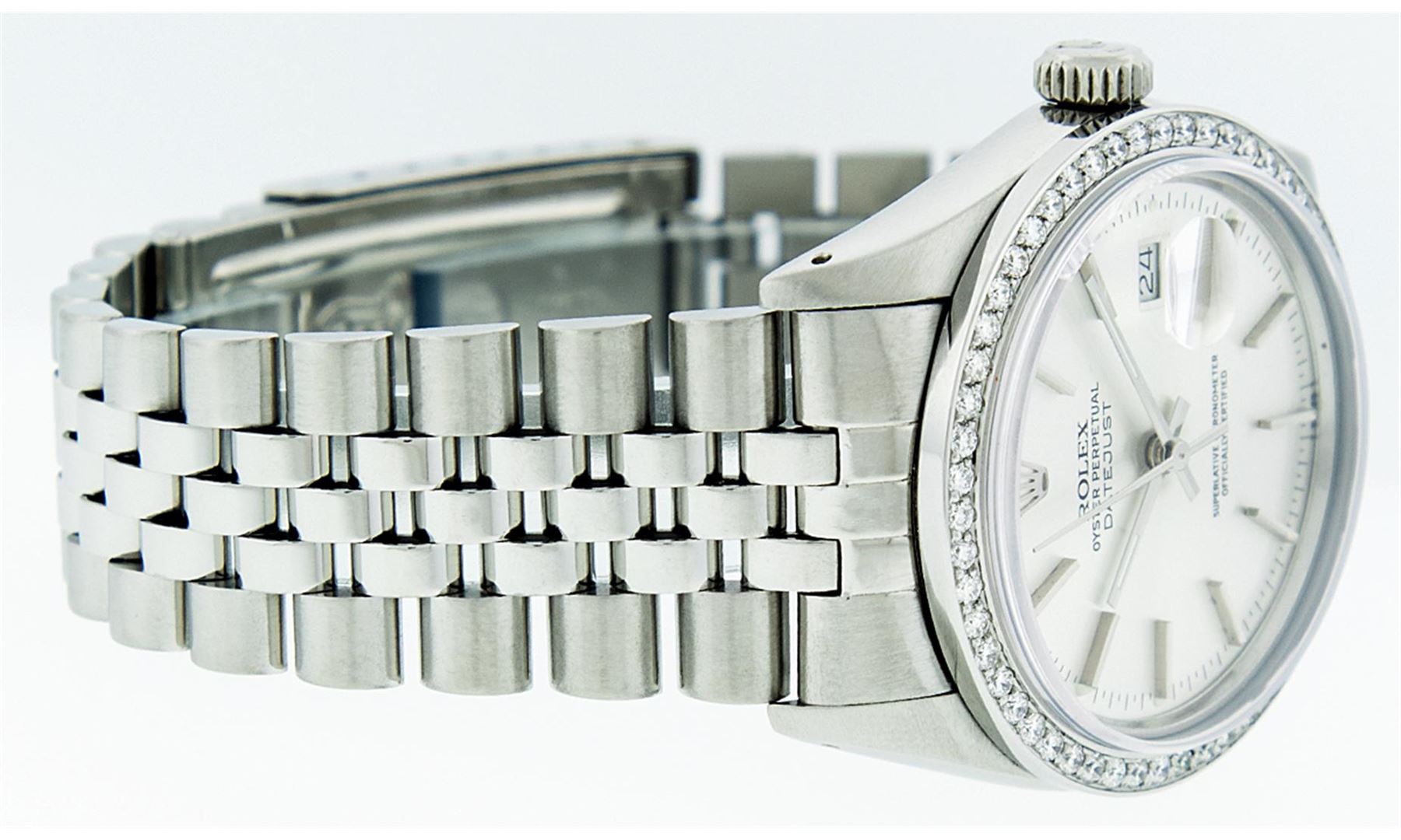 One Mens Rolex Datejust Polished Bright with Satin Finish, Serviced & Electronically Tested, Stainless Steel Case:36mm, Stainless Steel Crown, Custom Bezel: Stainless Steel Beadset Diamond Bezel, Diamond Count: 54 Diamonds Total Weight 1.00 Carat, Clarity: SI-VS, Color: G to H. Custom Crystal: Synthetic Sapphire Cyclops Lens. Movement: Automatic Winding Movement Caliber 3035. Dial: Silver Index Dial With Small Track And Lumi Dots. Date Window: 3 O'Clock Position Date Display, Quickset, Model: Datejust. Condition: G-6 Extra Fine. Bracelet: Stainless Steel Jubilee. Bright Polish & Satin Finish. 7.0 Inch Length, Adjustable. Standard Clasp, With Rolex Logo. Comes with 6 month warranty.