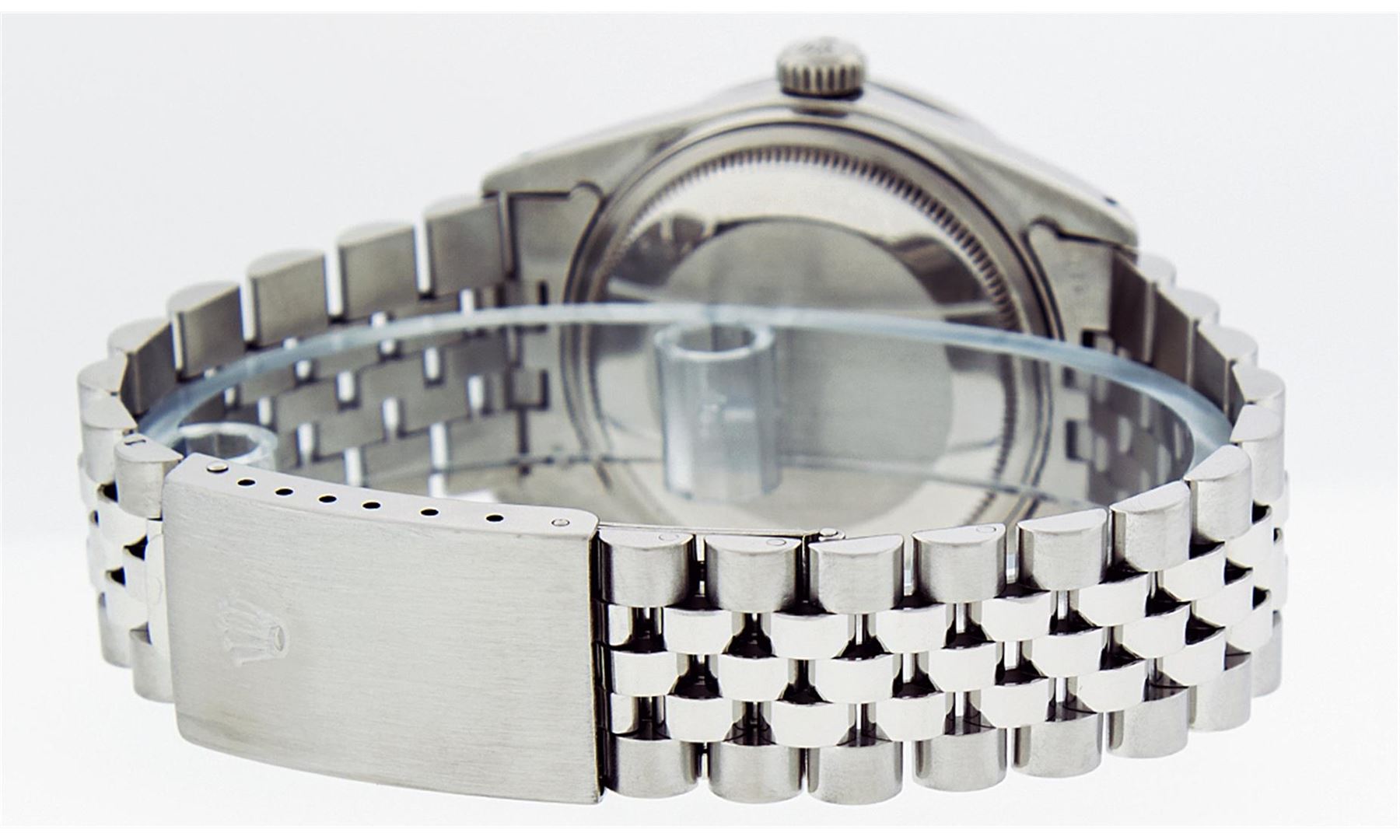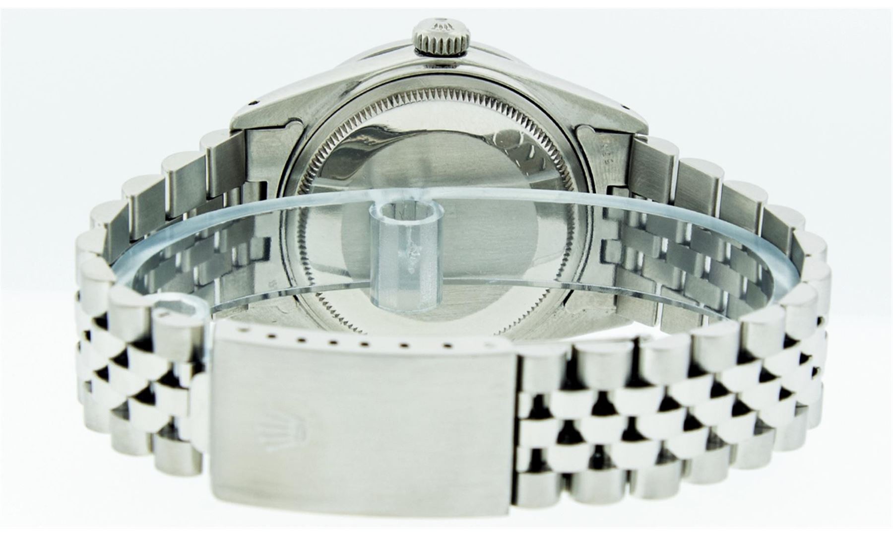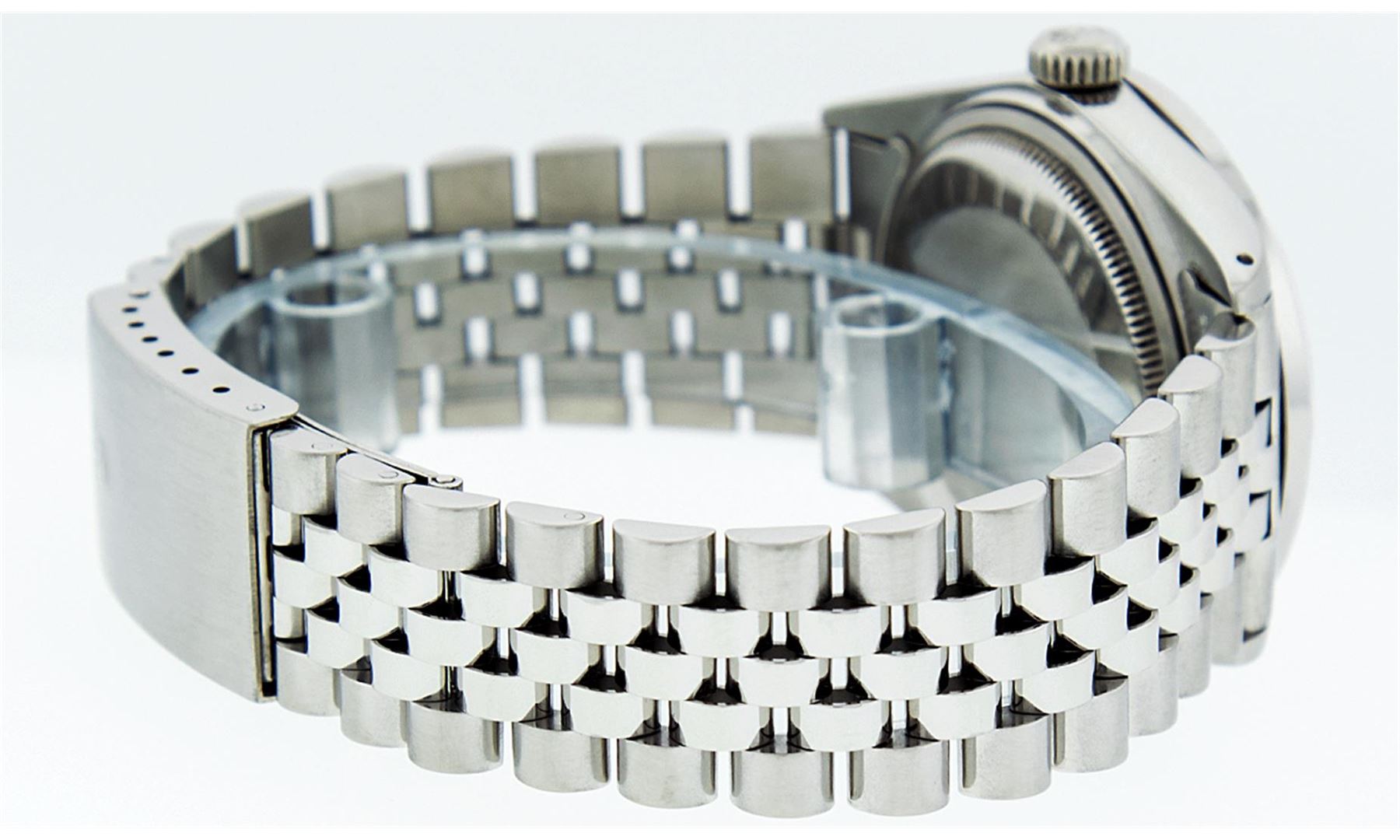 One Mens Rolex Datejust Polished Bright with Satin Finish, Serviced & Electronically Tested, Stainless Steel Case:36mm, Stainless Steel Crown, Custom Bezel: Stainless Steel Beadset Diamond Bezel, Diamond Count: 54 Diamonds Total Weight 1.00 Carat, Clarity: SI-VS, Color: G to H. Custom Crystal: Synthetic Sapphire Cyclops Lens. Movement: Automatic Winding Movement Caliber 3035. Dial: Silver Index Dial With Small Track And Lumi Dots. Date Window: 3 O'Clock Position Date Display, Quickset, Model: Datejust. Condition: G-6 Extra Fine. Bracelet: Stainless Steel Jubilee. Bright Polish & Satin Finish. 7.0 Inch Length, Adjustable. Standard Clasp, With Rolex Logo. Comes with 6 month warranty.