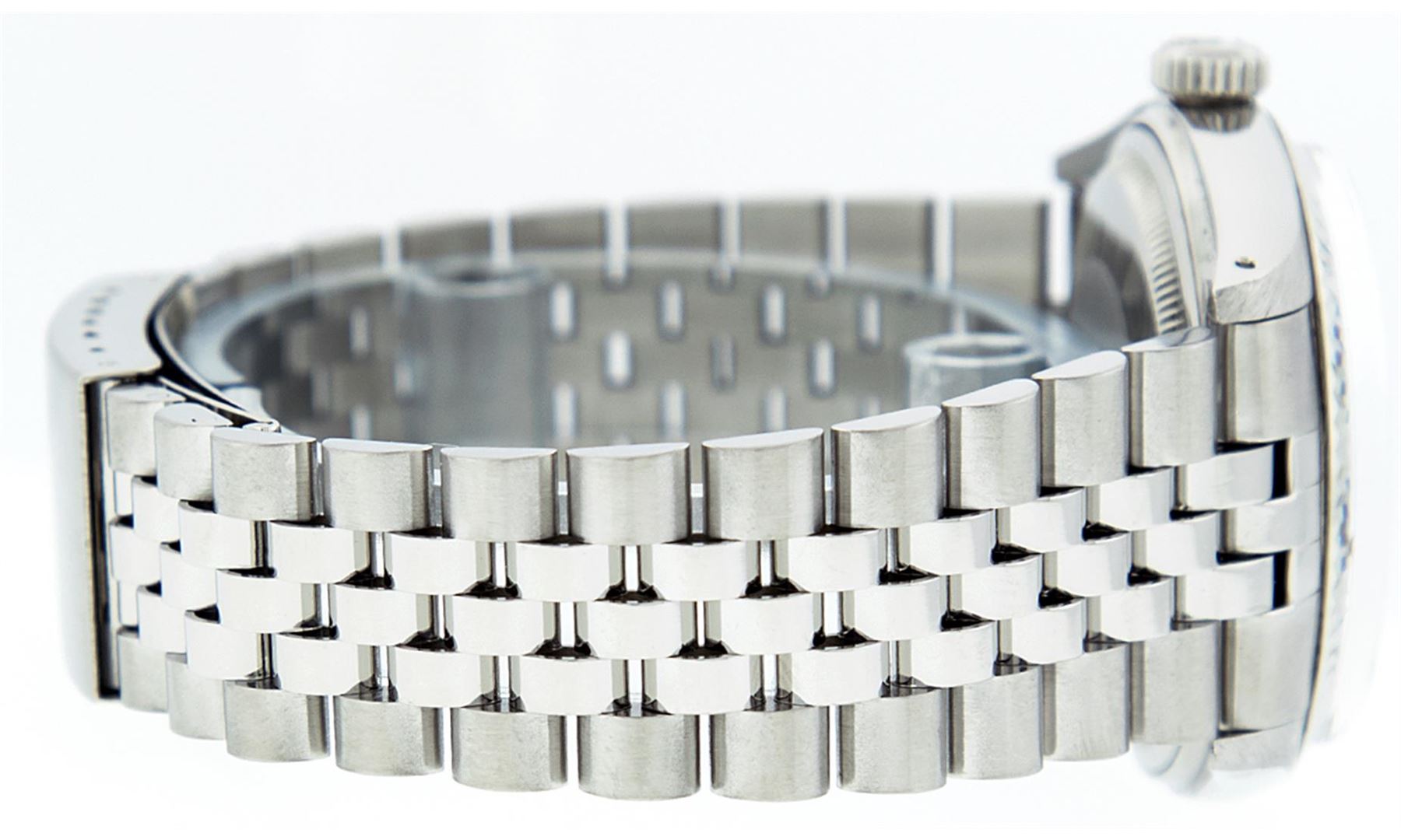 One Gents Rolex Datejust Polished, Serviced & Electronically Tested, Stainless Steel Case:36mm, Stainless Steel Crown, Bezel: 18K White Gold Fluted Bezel. Custom Crystal: Acrylic Cyclops Lens. Movement: Automatic Winding Movement Caliber 3035. Custom Dial: Purple With Diamond Hour Markers And Square Roman Track Square Setting, Diamond Count: 8 Diamonds + 2 Baguettes, Clarity: SI-VS, Color: G to H. Date Window: 3 O'Clock Position Date Display, Quickset, Model: Datejust Condition: G-6 Extra Fine. Bracelet: Stainless Steel Jubilee. Bright Polish & Satin Finish. 7.0 Inch Length, Adjustable. Standard Clasp, With Rolex Logo. Comes with 6 month warranty.