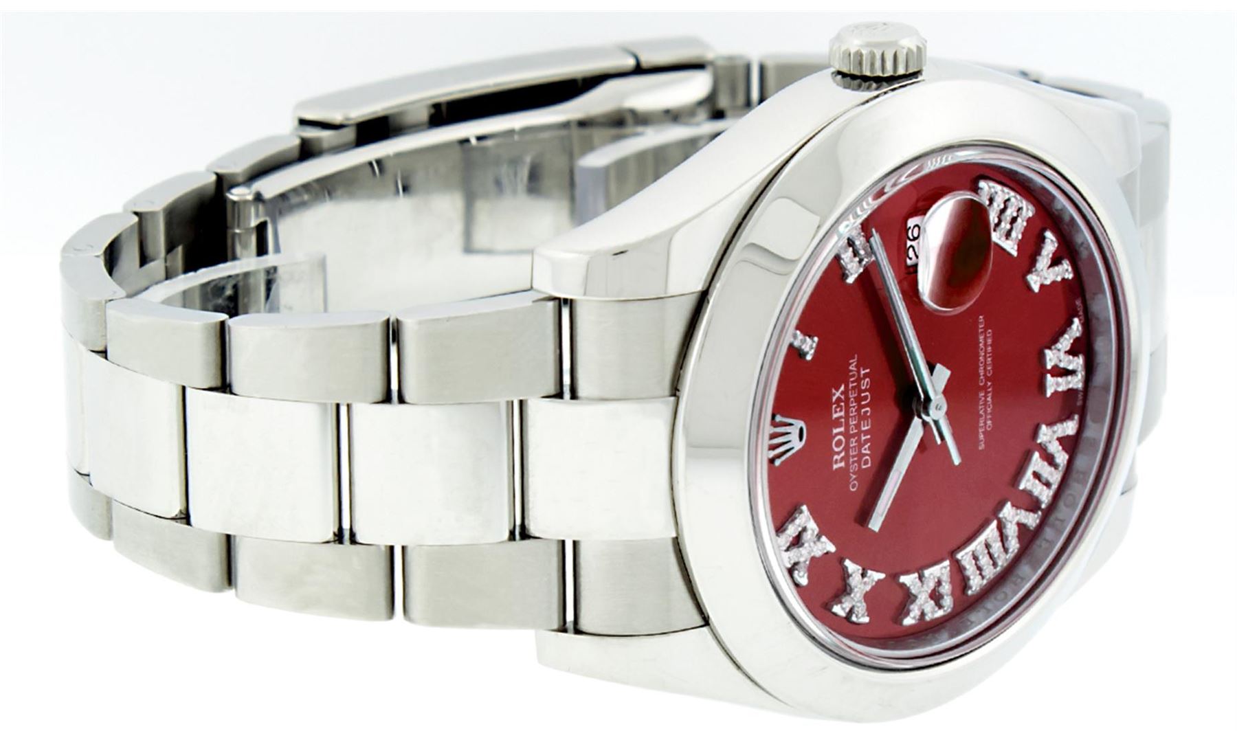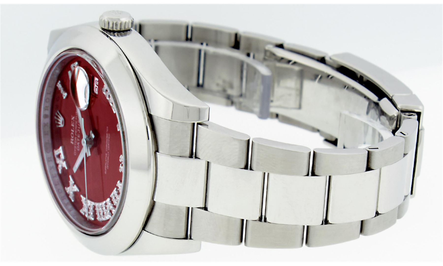 One Mens Rolex Datejust 2 Polished Bright with Shiny Finish, Serviced & Electronically Tested, Stainless Steel Case:41mm, Stainless Steel Crown, Bezel: Stainless Steel Smooth Bezel, . Crystal: Synthetic Sapphire Cyclops Lens. Movement: Automatic Winding Movement Caliber 3136. Custom Dial: Red Roman Diamond Dial, Diamond Color: G To H, Clarity: SI-VS. Date Window: 3 O'Clock Position Date Display, Quickset, Model: 116300 Datejust 2. Condition: G-6 Extra Fine The Watch Is In Very Good Condition Free Of All Scratches And Dents. Bracelet: Stainless Steel Oyster Band. Bright Polish & Satin Finish. 7.5 Inch Length, Adjustable. Standard Clasp, With Rolex Logo. Comes with 6 month warranty.