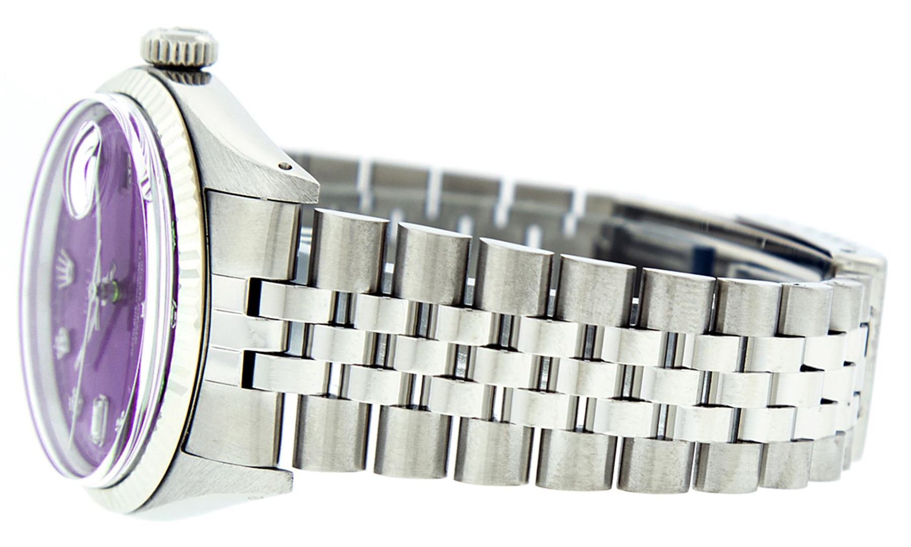 One Gents Rolex Datejust Polished, Serviced & Electronically Tested, Stainless Steel Case:36mm, Stainless Steel Crown, Bezel: 18K White Gold Fluted Bezel. Custom Crystal: Acrylic Cyclops Lens. Movement: Automatic Winding Movement Caliber 3035. Custom Dial: Purple With Diamond Hour Markers And Square Roman Track Square Setting, Diamond Count: 8 Diamonds + 2 Baguettes, Clarity: SI-VS, Color: G to H. Date Window: 3 O'Clock Position Date Display, Quickset, Model: Datejust Condition: G-6 Extra Fine. Bracelet: Stainless Steel Jubilee. Bright Polish & Satin Finish. 7.0 Inch Length, Adjustable. Standard Clasp, With Rolex Logo. Comes with 6 month warranty.
