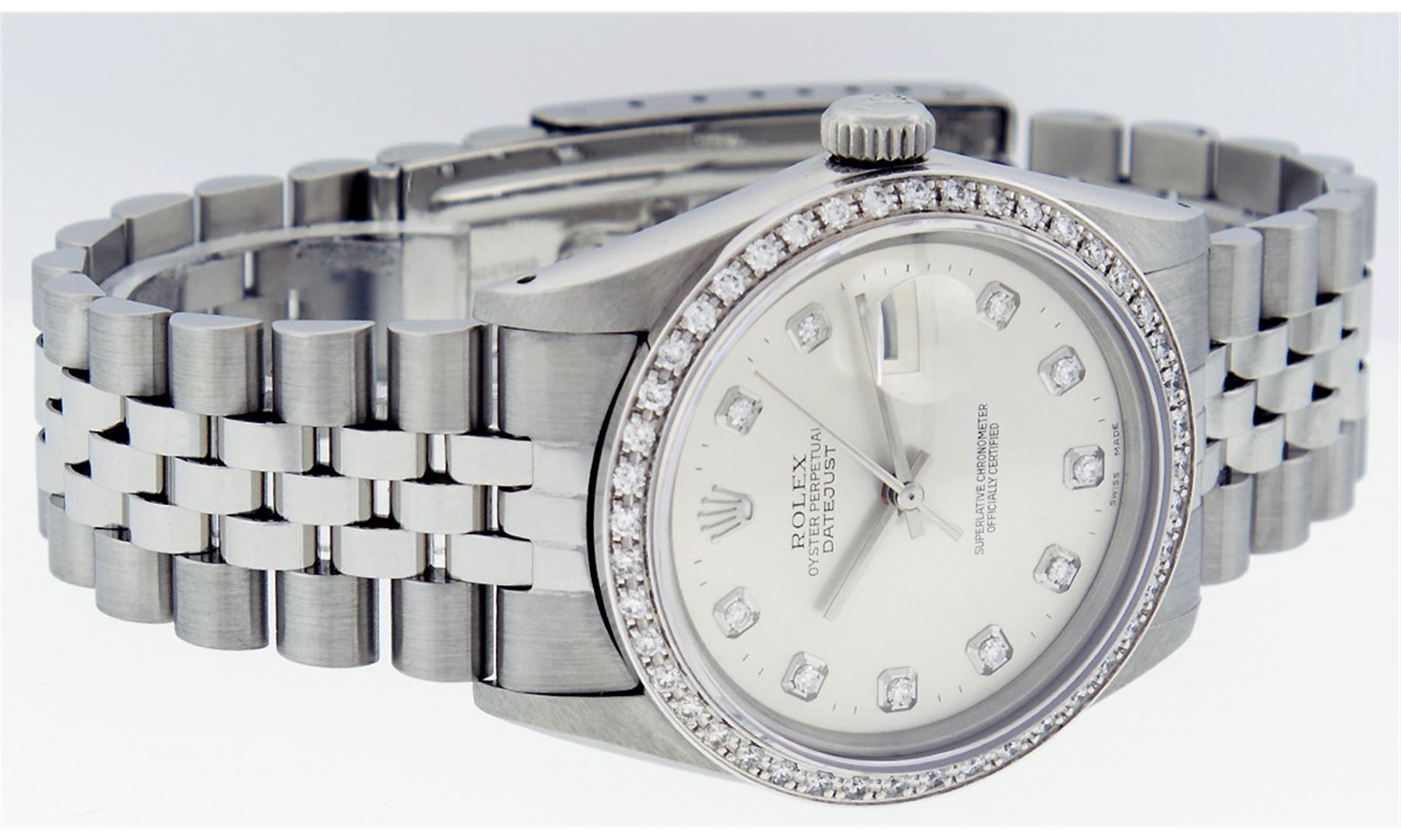 One Mens Stainless Steel Rolex Datejust Polished Bright with Satin Finish, Fully Serviced & Electronically Tested, Stainless Steel Case:36mm, Stainless Steel Crown, Custom Bezel: 18K White Gold Beadset Diamond Bezel, Diamond Count: 44 Diamonds Total Weight 1.00 Carat, Clarity: SI-VS, Color: G to H. Custom Crystal: Synthetic Sapphire Cyclops Lens. Movement: Automatic Winding Movement Caliber 3035. Custom Dial: Silver With Diamond Hour Markers And Line Track, 10 Diamonds in Dial G To H In Color, Clarity: SI-VS. Date Window: 3 O'Clock Position Date Display, Quickset, Model: Datejust, Condition: G-6 Extra Fine. Bracelet: Stainless Steel Jubilee. Bright Polish & Satin Finish. 7.0 Inch Length, Adjustable. Standard Clasp, With Rolex Logo.