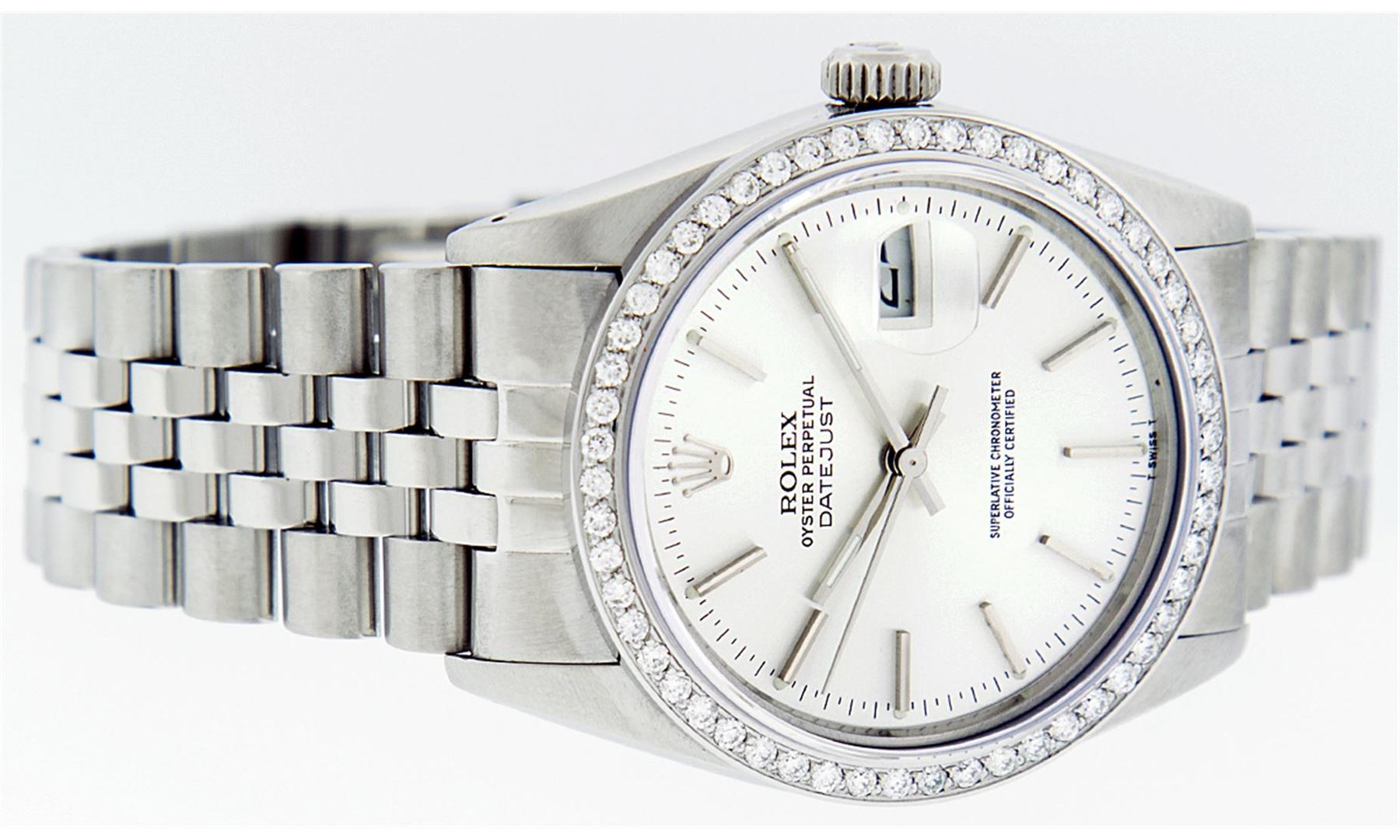 One Mens Rolex Datejust Polished Bright with Satin Finish, Serviced & Electronically Tested, Stainless Steel Case:36mm, Stainless Steel Crown, Custom Bezel: Stainless Steel Beadset Diamond Bezel, Diamond Count: 54 Diamonds Total Weight 1.00 Carat, Clarity: SI-VS, Color: G to H. Custom Crystal: Synthetic Sapphire Cyclops Lens. Movement: Automatic Winding Movement Caliber 3035. Dial: Silver Index Dial With Small Track And Lumi Dots. Date Window: 3 O'Clock Position Date Display, Quickset, Model: Datejust. Condition: G-6 Extra Fine. Bracelet: Stainless Steel Jubilee. Bright Polish & Satin Finish. 7.0 Inch Length, Adjustable. Standard Clasp, With Rolex Logo. Comes with 6 month warranty.