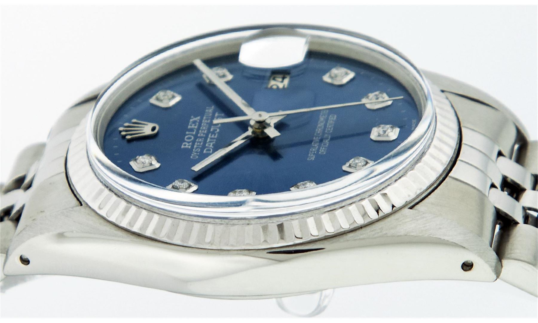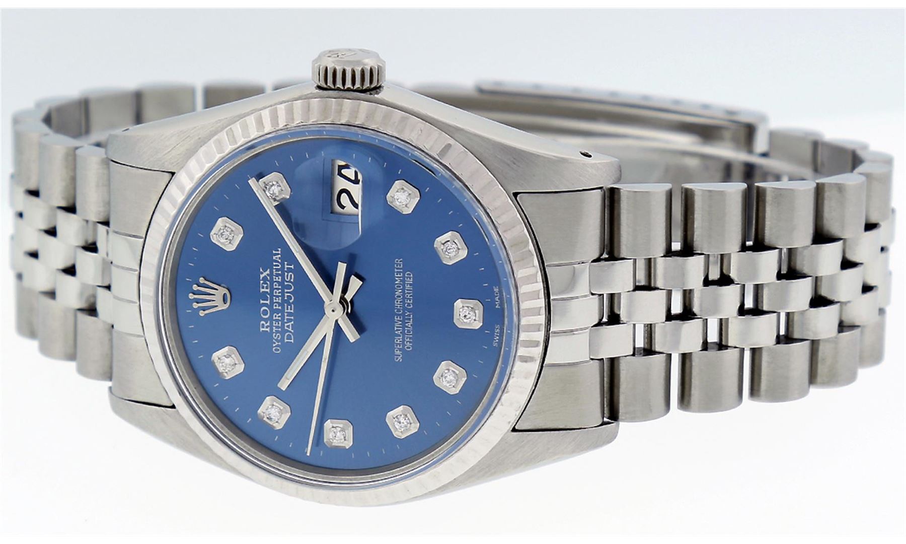 One Gents Rolex Datejust Polished, Serviced & Electronically Tested, Stainless Steel Case:36mm, Stainless Steel Crown, Bezel: 18K White Gold Fluted Bezel. Custom Crystal: Acrylic Cyclops Lens. Movement: Automatic Winding Movement Caliber 3035. Custom Dial: Blue Dial With Diamond Hour Markers And Line Track, Diamond Count: 10 Diamonds, Clarity: SI-VS, Color: G To H. Date Window: 3 O'Clock Position Date Display, Quickset, Model: Datejust Condition: G-6 Extra Fine. Bracelet: Stainless Steel Jubilee. Bright Polish & Satin Finish. 7 Inch Length, Adjustable. Standard Clasp, With Rolex Logo.