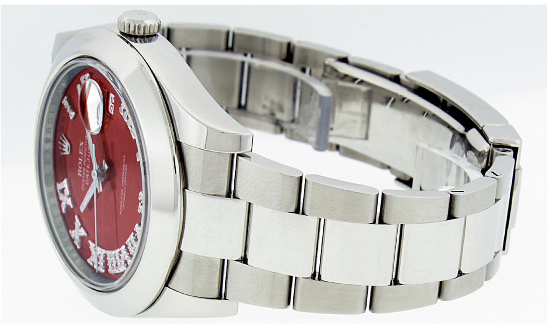 One Mens Rolex Datejust 2 Polished Bright with Shiny Finish, Serviced & Electronically Tested, Stainless Steel Case:41mm, Stainless Steel Crown, Bezel: Stainless Steel Smooth Bezel, . Crystal: Synthetic Sapphire Cyclops Lens. Movement: Automatic Winding Movement Caliber 3136. Custom Dial: Red Roman Diamond Dial, Diamond Color: G To H, Clarity: SI-VS. Date Window: 3 O'Clock Position Date Display, Quickset, Model: 116300 Datejust 2. Condition: G-6 Extra Fine The Watch Is In Very Good Condition Free Of All Scratches And Dents. Bracelet: Stainless Steel Oyster Band. Bright Polish & Satin Finish. 7.5 Inch Length, Adjustable. Standard Clasp, With Rolex Logo. Comes with 6 month warranty.