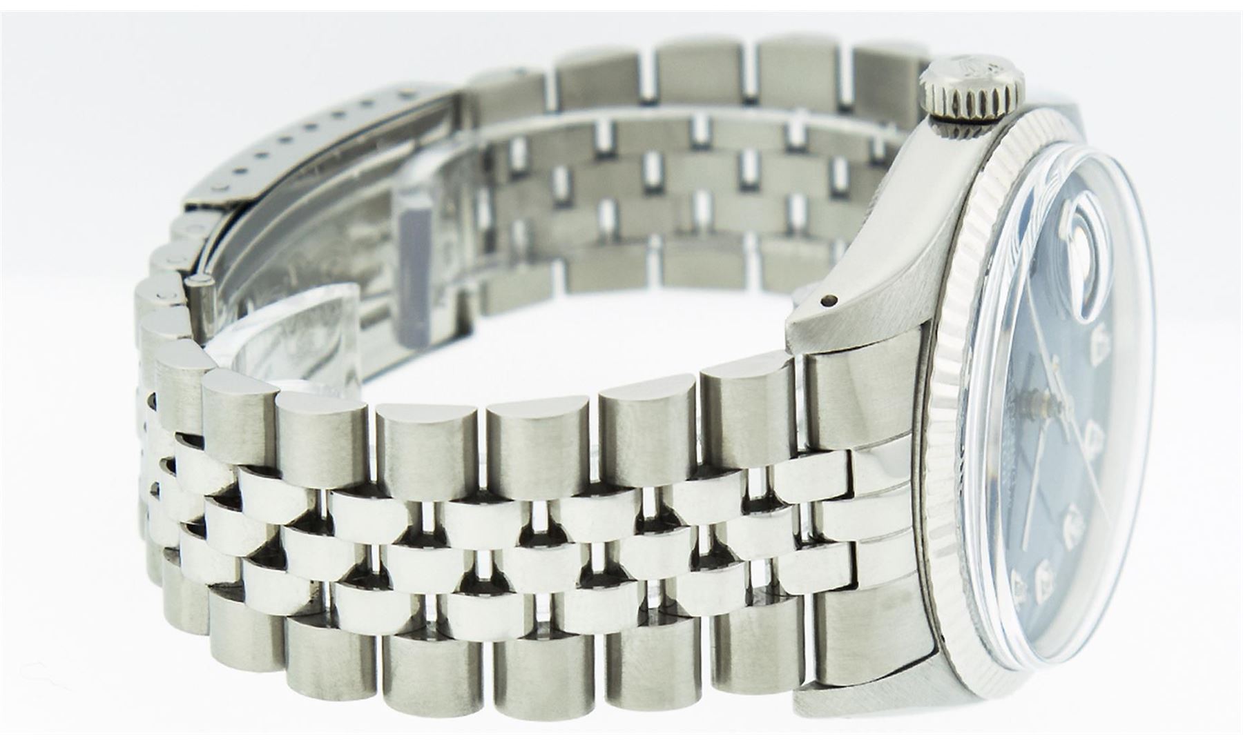 One Gents Rolex Datejust Polished, Serviced & Electronically Tested, Stainless Steel Case:36mm, Stainless Steel Crown, Bezel: 18K White Gold Fluted Bezel. Custom Crystal: Acrylic Cyclops Lens. Movement: Automatic Winding Movement Caliber 3035. Custom Dial: Blue Dial With Diamond Hour Markers And Line Track, Diamond Count: 10 Diamonds, Clarity: SI-VS, Color: G To H. Date Window: 3 O'Clock Position Date Display, Quickset, Model: Datejust Condition: G-6 Extra Fine. Bracelet: Stainless Steel Jubilee. Bright Polish & Satin Finish. 7 Inch Length, Adjustable. Standard Clasp, With Rolex Logo.