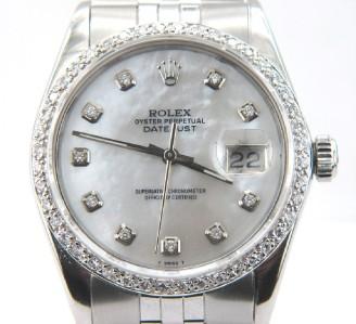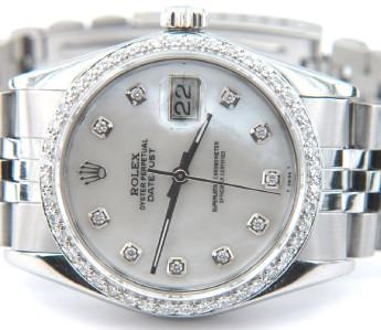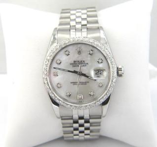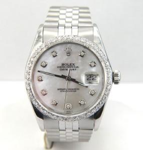 Rolex Stainless Steel Oyster Perpetual, Date Just, Diamond, Mens Watch.The total watch's weight is 91.1 grams.The total weight of diamond is 2 ct. approximately, H color, VS clarity.The size of watch head: 35 x 35 mm and 13 mm thick.Dial: Mother of Pearl.The length of the watch is 6.75".Swiss Made.Water Resistant.Chain is 19 mm wide