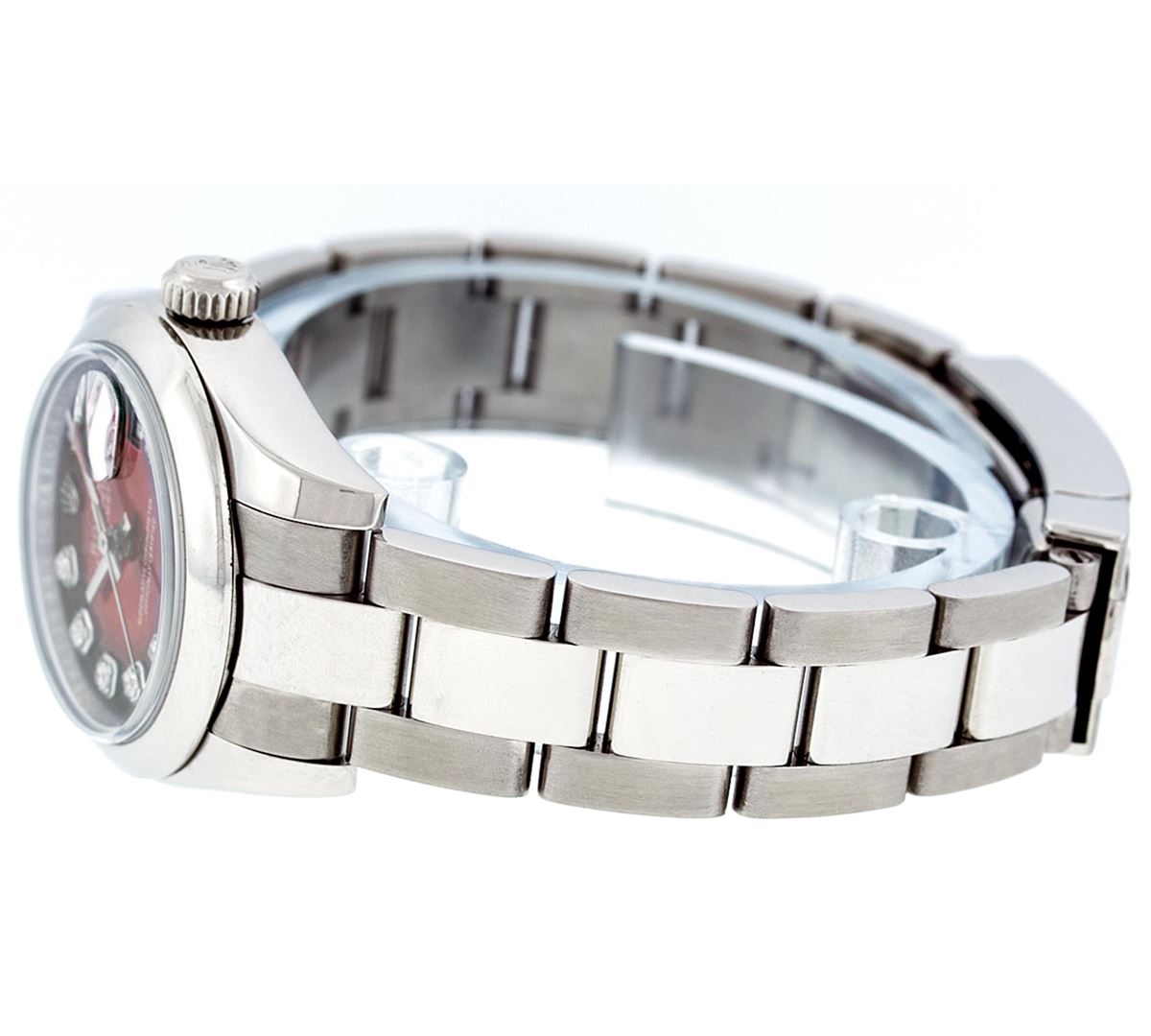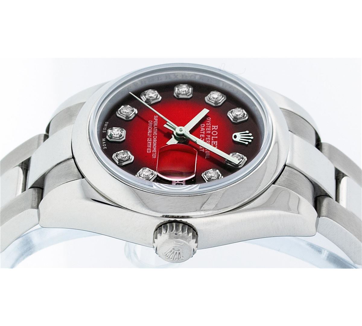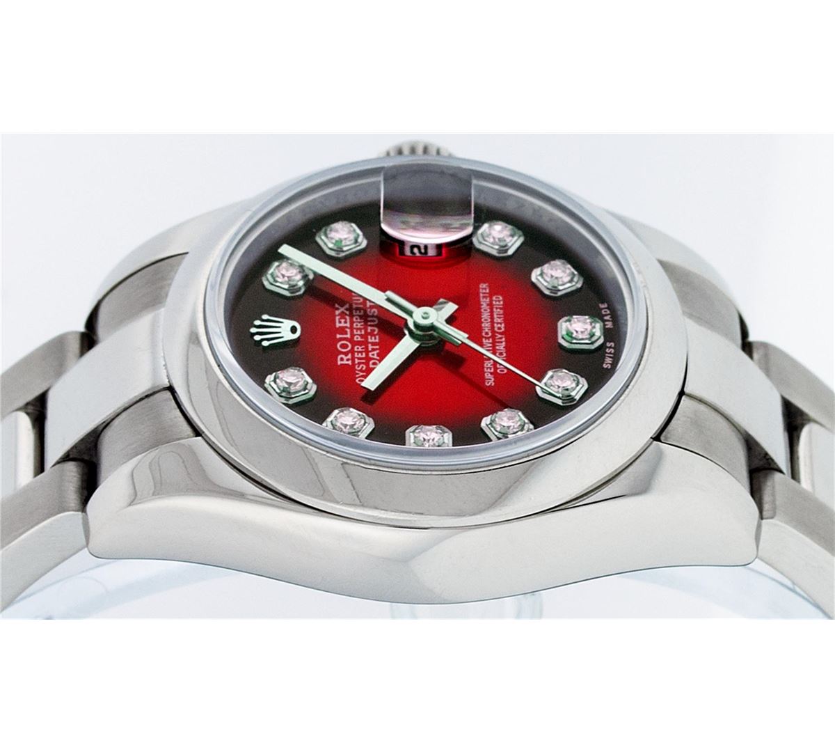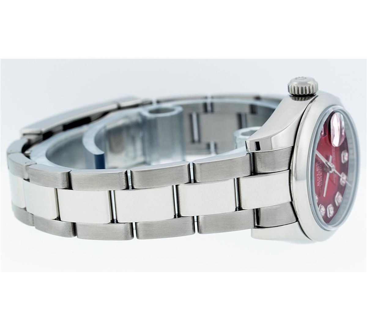 One Ladies Rolex Datejust Polished Bright with Satin Finish, Serviced & Electronically Tested, Stainless Steel Case:26mm, Stainless Steel Crown, Bezel: Stainless Steel Smooth Bezel. Custom Crystal: Synthetic Sapphire Cyclops Lens. Movement: Automatic Winding Movement Caliber 2235. Custom Dial: Refinished Red Vignette Diamond VVS, Diamond Count: 10 Diamonds in Dial G To H In Color, Clarity: VVS. Date Window: 3 O'Clock Position Date Display, Model: Quickset No Hole Datejust 179160. Condition: G-6 Extra Fine. Bracelet: Stainless Steel Oyster. Bright Polish & Satin Finish. 6.0 Inch Length, Adjustable. Standard Clasp, With Rolex Logo.
