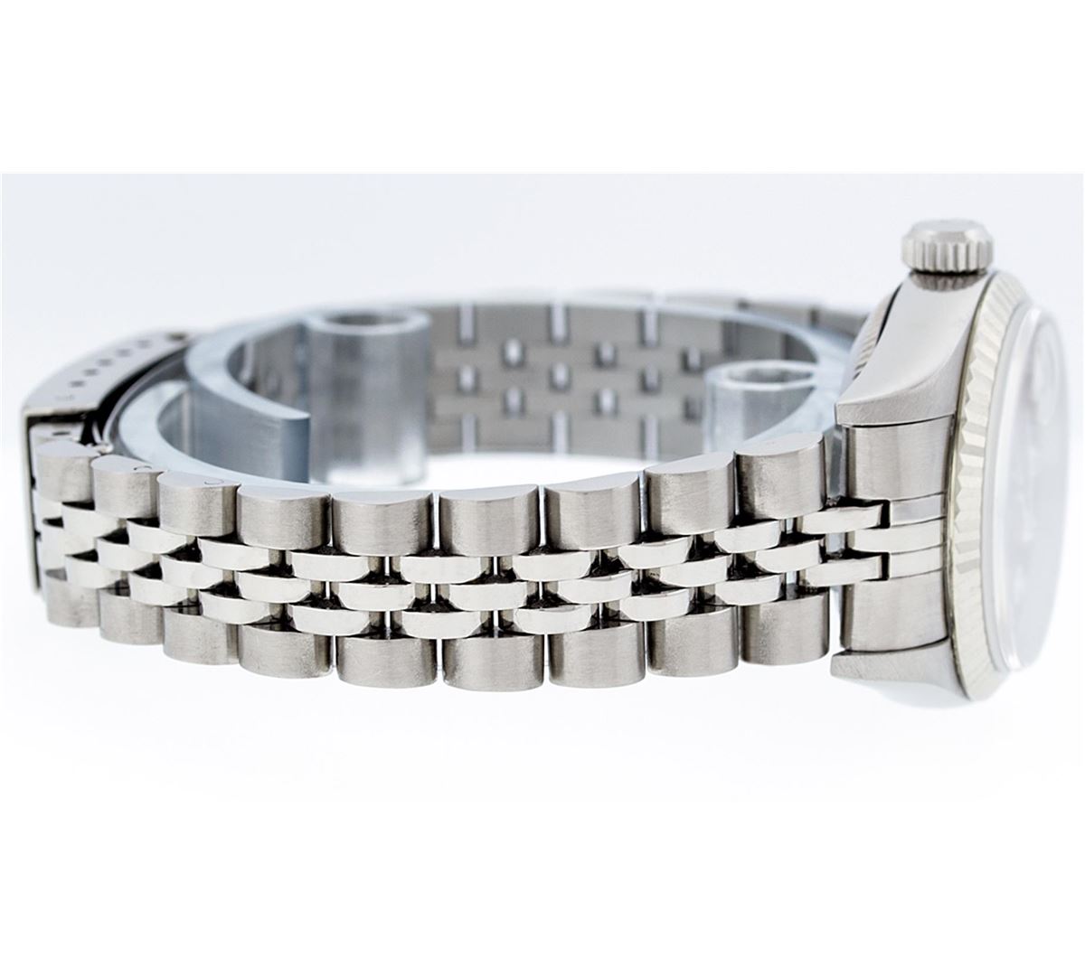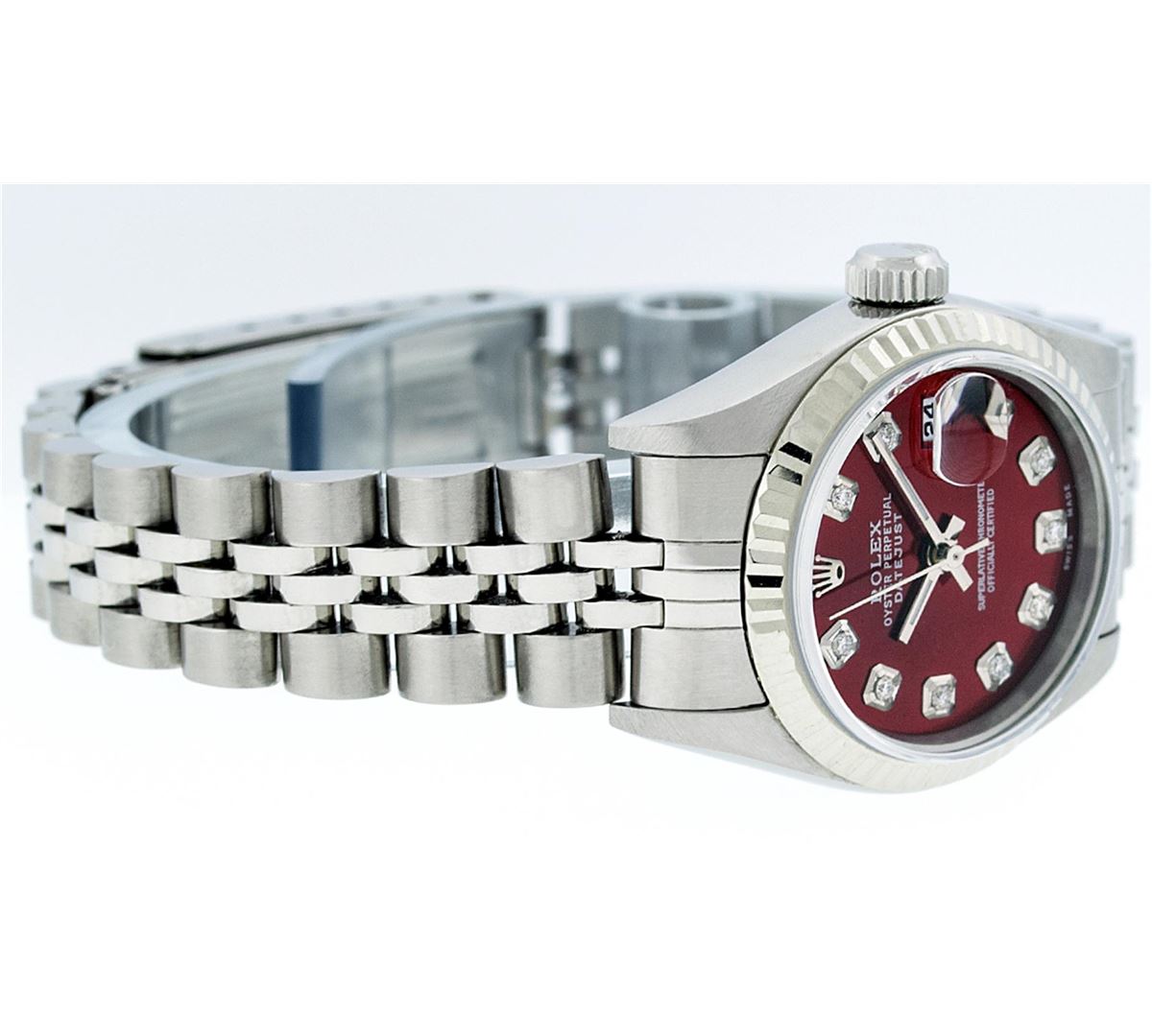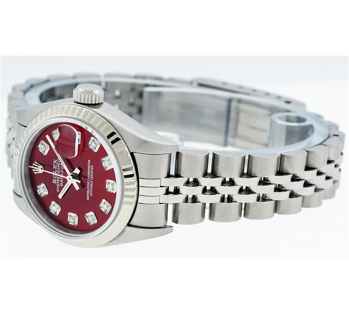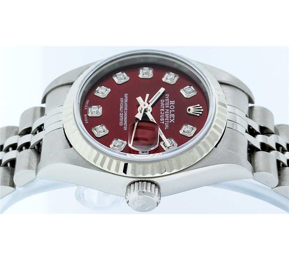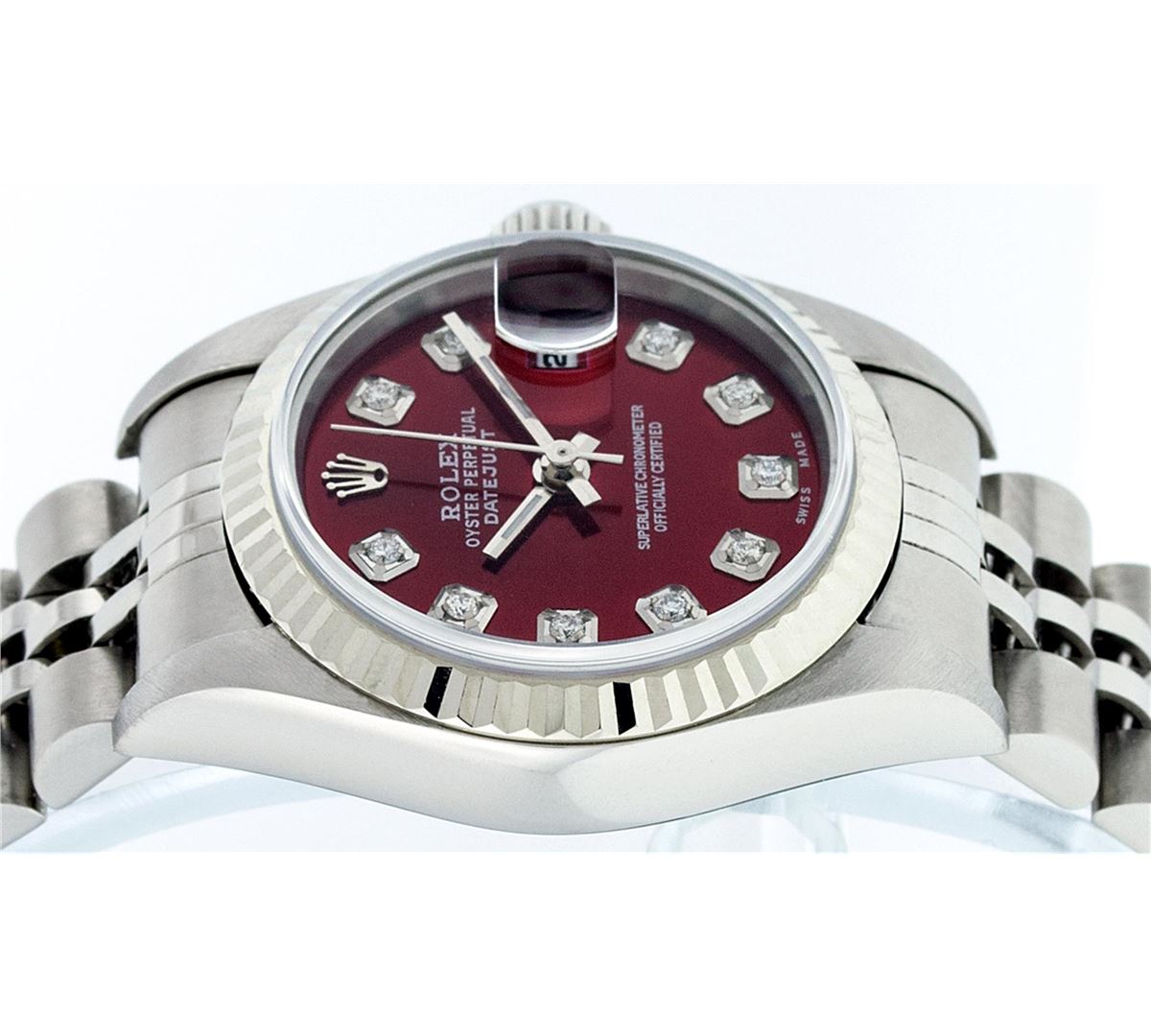 One Ladies Rolex Datejust Polished Bright with Satin Finish, Serviced & Electronically Tested, Stainless Steel Case:26mm, Stainless Steel Crown, Bezel: 18K White Gold Fluted Bezel, Custom Crystal: Synthetic Sapphire Cyclops Lens. Movement: Automatic Winding Movement Caliber 2235. Custom Dial: Refinished Red Diamond Dial, 10 Diamonds in Dial G To H In Color, Clarity: SI-VS. Date Window: 3 O'clock Position Date Display, Model: No Hole Datejust Quickset. Condition: G-6 Extra Fine. Bracelet: Stainless Steel Jubilee Band. Bright Polish & Satin Finish. 6.0 Inch Length, Adjustable. Standard Clasp, With Rolex Logo. Comes with 6 month warranty.