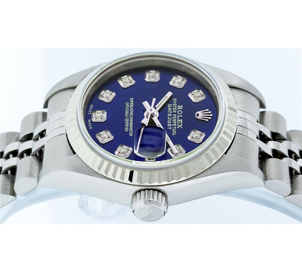 One Ladies Rolex Datejust Polished Bright with Satin Finish, Serviced & Electronically Tested, Stainless Steel Case:26mm, Stainless Steel Crown, Bezel:18K White Gold Fluted Bezel, Custom Crystal: Synthetic Sapphire Cyclops Lens. Movement: Automatic Winding Movement Caliber 2235. Custom Dial: Refinished Blue Diamond Dial, 10 Diamonds in Dial G To H In Color, Clarity: SI-VS. Date Window: 3 O'clock Position Date Display, Model: No Hole Datejust Quickset. Condition: G-6 Extra Fine. Bracelet: Stainless Steel Jubilee Band. Bright Polish & Satin Finish. 6.0 Inch Length, Adjustable. Standard Clasp, With Rolex Logo. Comes with 6 month warranty.
