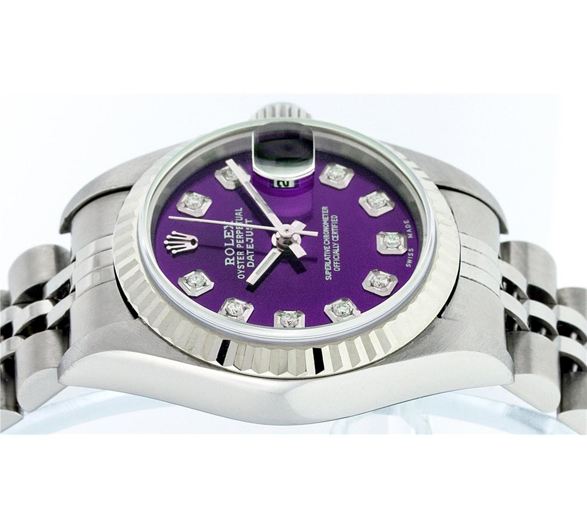 One Ladies Rolex Datejust Polished Bright with Satin Finish, Serviced & Electronically Tested, Stainless Steel Case:26mm, Stainless Steel Crown, Bezel: 18K White Gold Fluted Bezel, Custom Crystal: Synthetic Sapphire Cyclops Lens. Movement: Automatic Winding Movement Caliber 2235. Custom Dial: Refinished Purple Diamond Dial, 10 Diamonds in Dial G To H In Color, Clarity: SI-VS. Date Window: 3 O'clock Position Date Display, Model: No Hole Datejust Quickset. Condition: G-6 Extra Fine. Bracelet: Stainless Steel Jubilee Band. Bright Polish & Satin Finish. 6.0 Inch Length, Adjustable. Standard Clasp, With Rolex Logo. Comes with 6 month warranty.