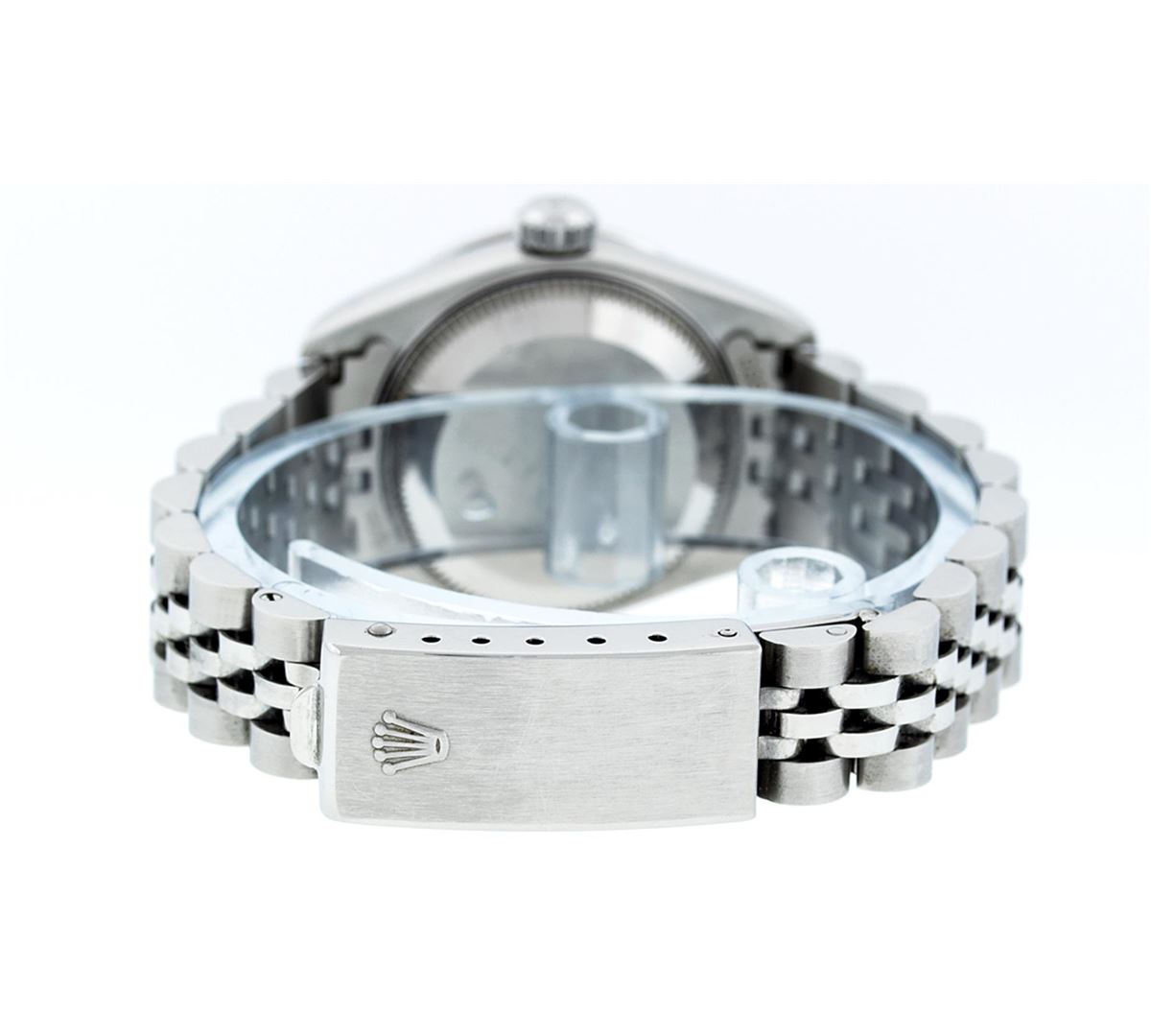 One Ladies Rolex Datejust Polished Bright with Satin Finish, Serviced & Electronically Tested, Stainless Steel Case:26mm, Stainless Steel Crown, Bezel: 18K White Gold Fluted Bezel, Custom Crystal: Synthetic Sapphire Cyclops Lens. Movement: Automatic Winding Movement Caliber 2235. Custom Dial: Refinished Green Diamond Dial, 10 Diamonds in Dial G To H In Color, Clarity: SI-VS. Date Window: 3 O'clock Position Date Display, Model: No Hole Datejust Quickset. Condition: G-6 Extra Fine. Bracelet: Stainless Steel Jubilee Band. Bright Polish & Satin Finish. 6.0 Inch Length, Adjustable. Standard Clasp, With Rolex Logo. Comes with 6 month warranty.