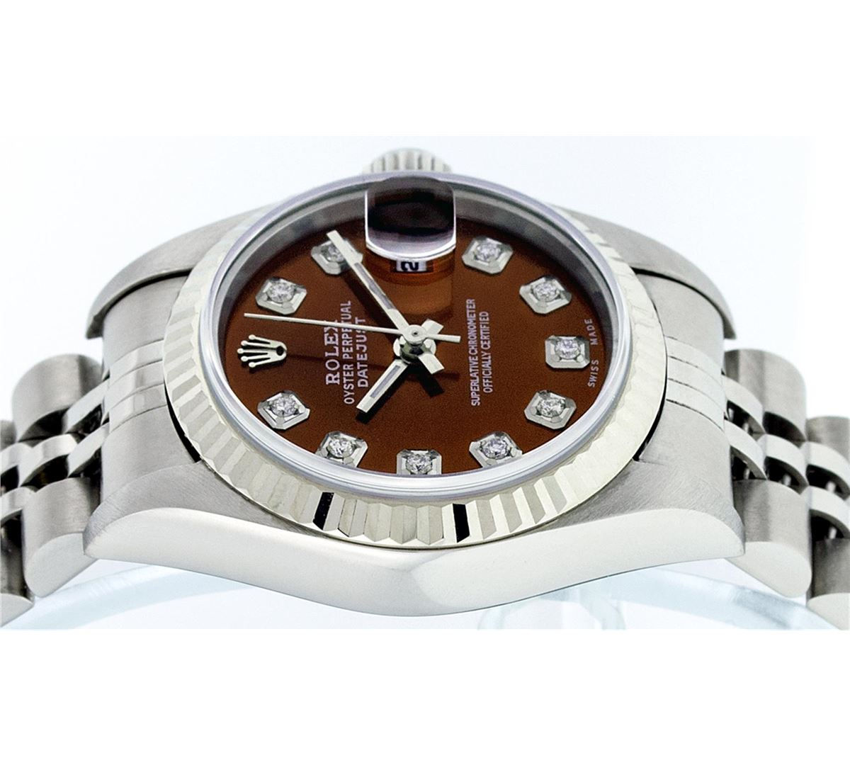 One Ladies Rolex Datejust Polished Bright with Satin Finish, Serviced & Electronically Tested, Stainless Steel Case:26mm, Stainless Steel Crown, Bezel:18K White Gold Fluted Bezel, Custom Crystal: Synthetic Sapphire Cyclops Lens. Movement: Automatic Winding Movement Caliber 2235. Custom Dial: Refinished Brown Diamond Dial, 10 Diamonds in Dial G To H In Color, Clarity: SI-VS. Date Window: 3 O'clock Position Date Display, Model: No Hole Datejust Quickset. Condition: G-6 Extra Fine. Bracelet: Stainless Steel Jubilee Band. Bright Polish & Satin Finish. 6.0 Inch Length, Adjustable. Standard Clasp, With Rolex Logo. Comes with 6 month warranty.