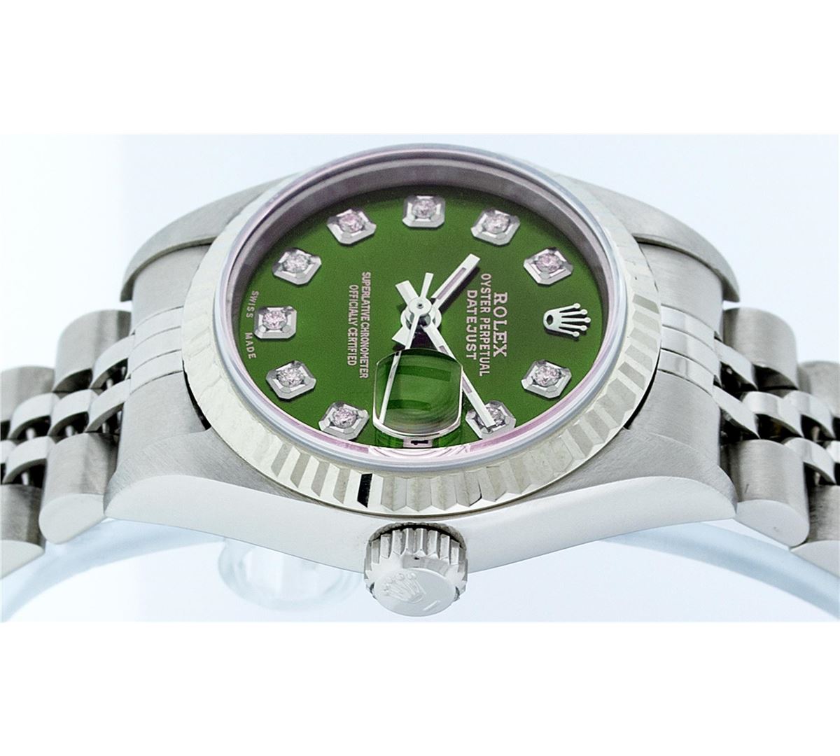 One Ladies Rolex Datejust Polished Bright with Satin Finish, Serviced & Electronically Tested, Stainless Steel Case:26mm, Stainless Steel Crown, Bezel: 18K White Gold Fluted Bezel, Custom Crystal: Synthetic Sapphire Cyclops Lens. Movement: Automatic Winding Movement Caliber 2235. Custom Dial: Refinished Green Diamond Dial, 10 Diamonds in Dial G To H In Color, Clarity: SI-VS. Date Window: 3 O'clock Position Date Display, Model: No Hole Datejust Quickset. Condition: G-6 Extra Fine. Bracelet: Stainless Steel Jubilee Band. Bright Polish & Satin Finish. 6.0 Inch Length, Adjustable. Standard Clasp, With Rolex Logo. Comes with 6 month warranty.