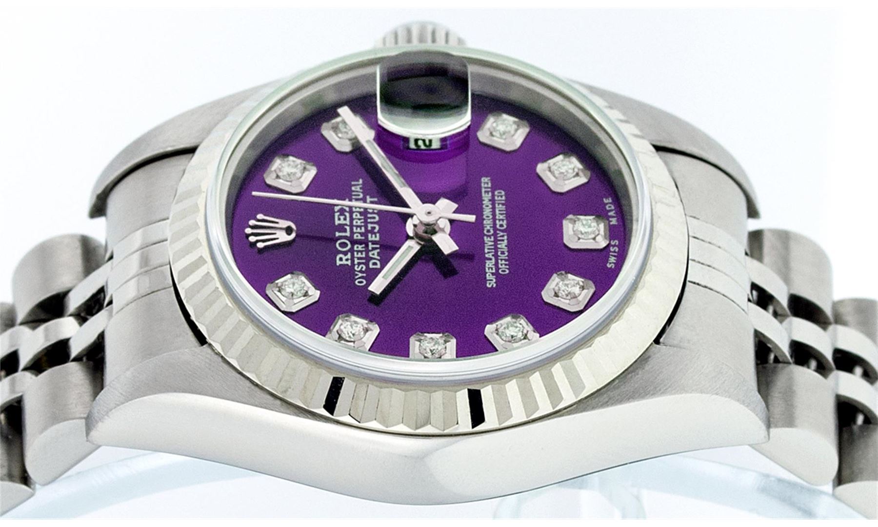 One Ladies Rolex Datejust Polished Bright with Satin Finish, Serviced & Electronically Tested, Stainless Steel Case:26mm, Stainless Steel Crown, Bezel: 18K White Gold Fluted Bezel, Custom Crystal: Synthetic Sapphire Cyclops Lens. Movement: Automatic Winding Movement Caliber 2235. Custom Dial: Refinished Purple Diamond Dial, 10 Diamonds in Dial G To H In Color, Clarity: SI-VS. Date Window: 3 O'clock Position Date Display, Model: No Hole Datejust Quickset. Condition: G-6 Extra Fine. Bracelet: Stainless Steel Jubilee Band. Bright Polish & Satin Finish. 6.0 Inch Length, Adjustable. Standard Clasp, With Rolex Logo. Comes with 6 month warranty.