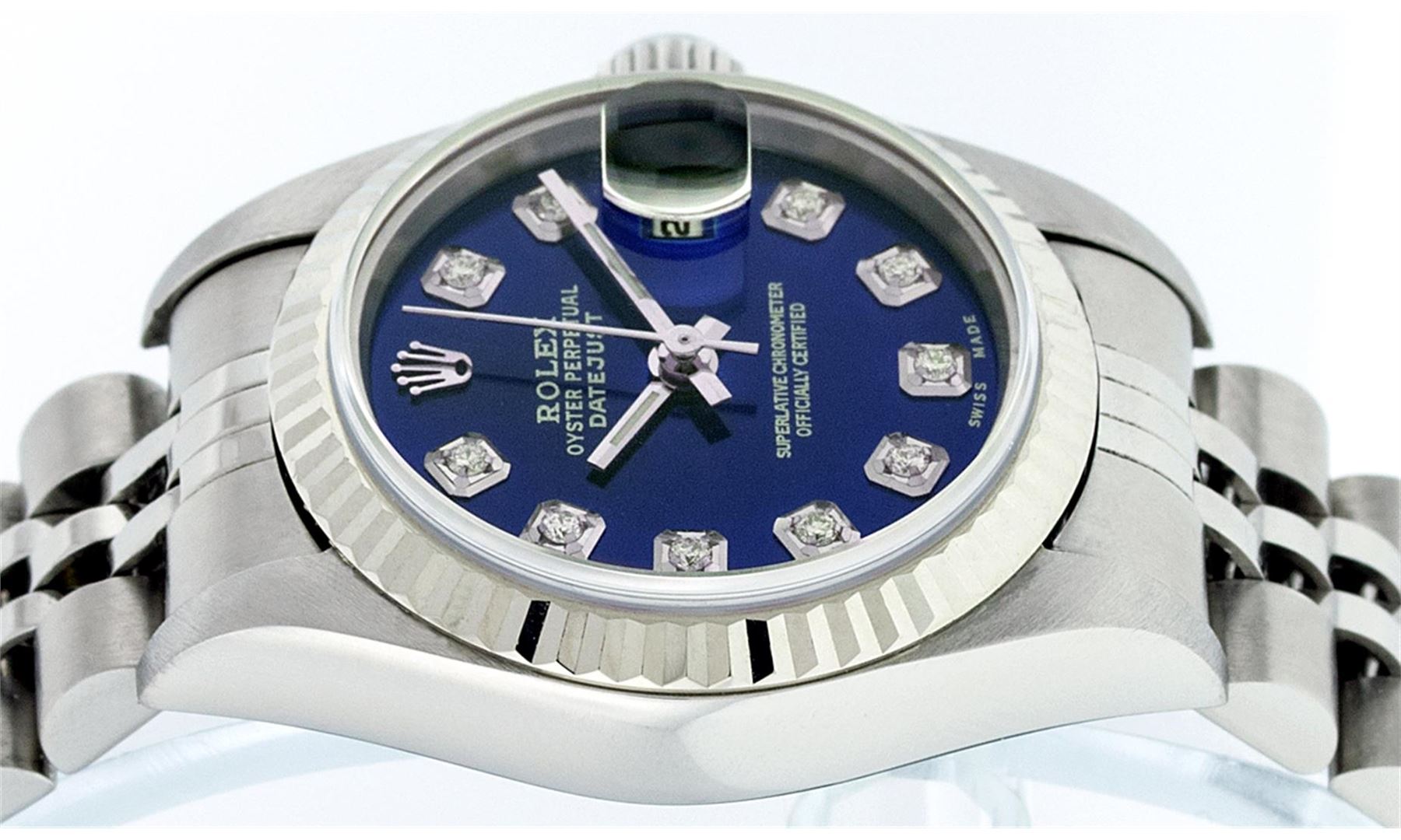 One Ladies Rolex Datejust Polished Bright with Satin Finish, Serviced & Electronically Tested, Stainless Steel Case:26mm, Stainless Steel Crown, Bezel:18K White Gold Fluted Bezel, Custom Crystal: Synthetic Sapphire Cyclops Lens. Movement: Automatic Winding Movement Caliber 2235. Custom Dial: Refinished Blue Diamond Dial, 10 Diamonds in Dial G To H In Color, Clarity: SI-VS. Date Window: 3 O'clock Position Date Display, Model: No Hole Datejust Quickset. Condition: G-6 Extra Fine. Bracelet: Stainless Steel Jubilee Band. Bright Polish & Satin Finish. 6.0 Inch Length, Adjustable. Standard Clasp, With Rolex Logo. Comes with 6 month warranty.