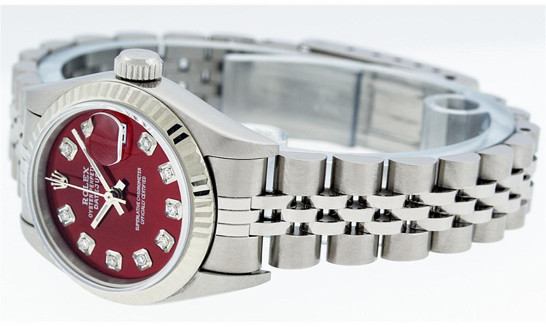 One Ladies Rolex Datejust Polished Bright with Satin Finish, Serviced & Electronically Tested, Stainless Steel Case:26mm, Stainless Steel Crown, Bezel: 18K White Gold Fluted Bezel, Custom Crystal: Synthetic Sapphire Cyclops Lens. Movement: Automatic Winding Movement Caliber 2235. Custom Dial: Refinished Red Diamond Dial, 10 Diamonds in Dial G To H In Color, Clarity: SI-VS. Date Window: 3 O'clock Position Date Display, Model: No Hole Datejust Quickset. Condition: G-6 Extra Fine. Bracelet: Stainless Steel Jubilee Band. Bright Polish & Satin Finish. 6.0 Inch Length, Adjustable. Standard Clasp, With Rolex Logo. Comes with 6 month warranty.