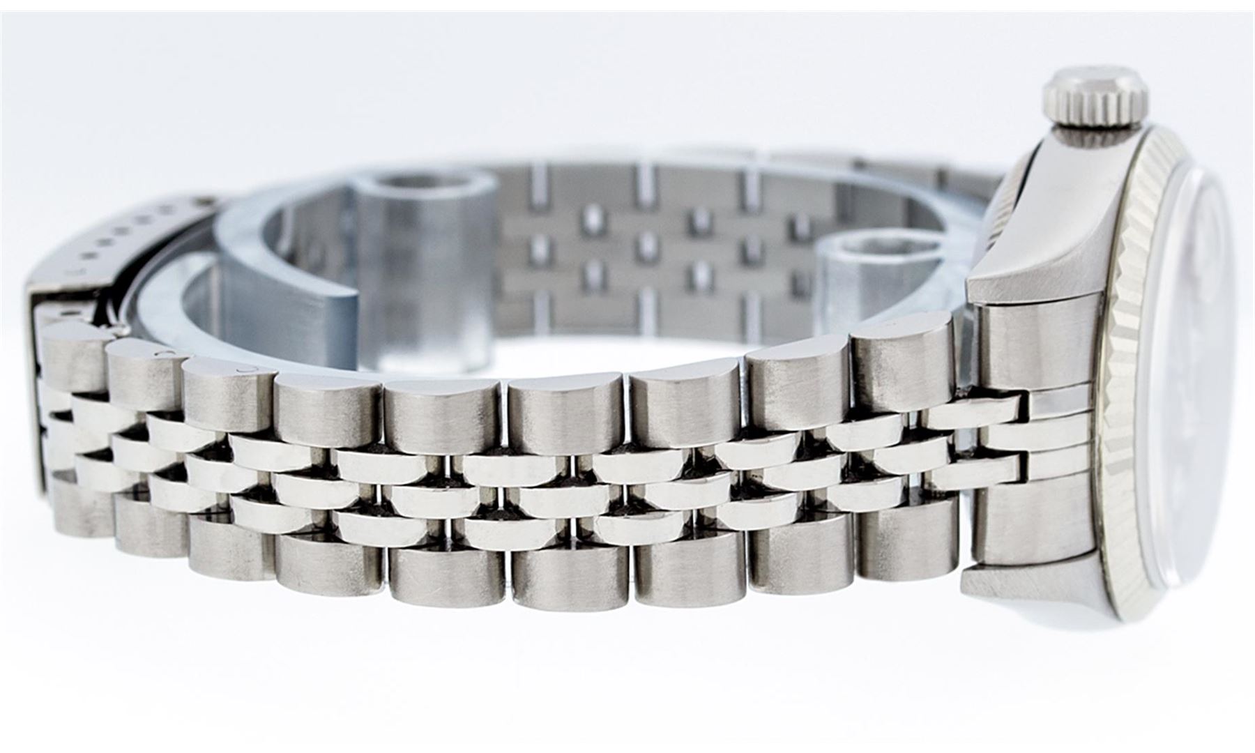 One Ladies Rolex Datejust Polished Bright with Satin Finish, Serviced & Electronically Tested, Stainless Steel Case:26mm, Stainless Steel Crown, Bezel:18K White Gold Fluted Bezel, Custom Crystal: Synthetic Sapphire Cyclops Lens. Movement: Automatic Winding Movement Caliber 2235. Custom Dial: Refinished Brown Diamond Dial, 10 Diamonds in Dial G To H In Color, Clarity: SI-VS. Date Window: 3 O'clock Position Date Display, Model: No Hole Datejust Quickset. Condition: G-6 Extra Fine. Bracelet: Stainless Steel Jubilee Band. Bright Polish & Satin Finish. 6.0 Inch Length, Adjustable. Standard Clasp, With Rolex Logo. Comes with 6 month warranty.