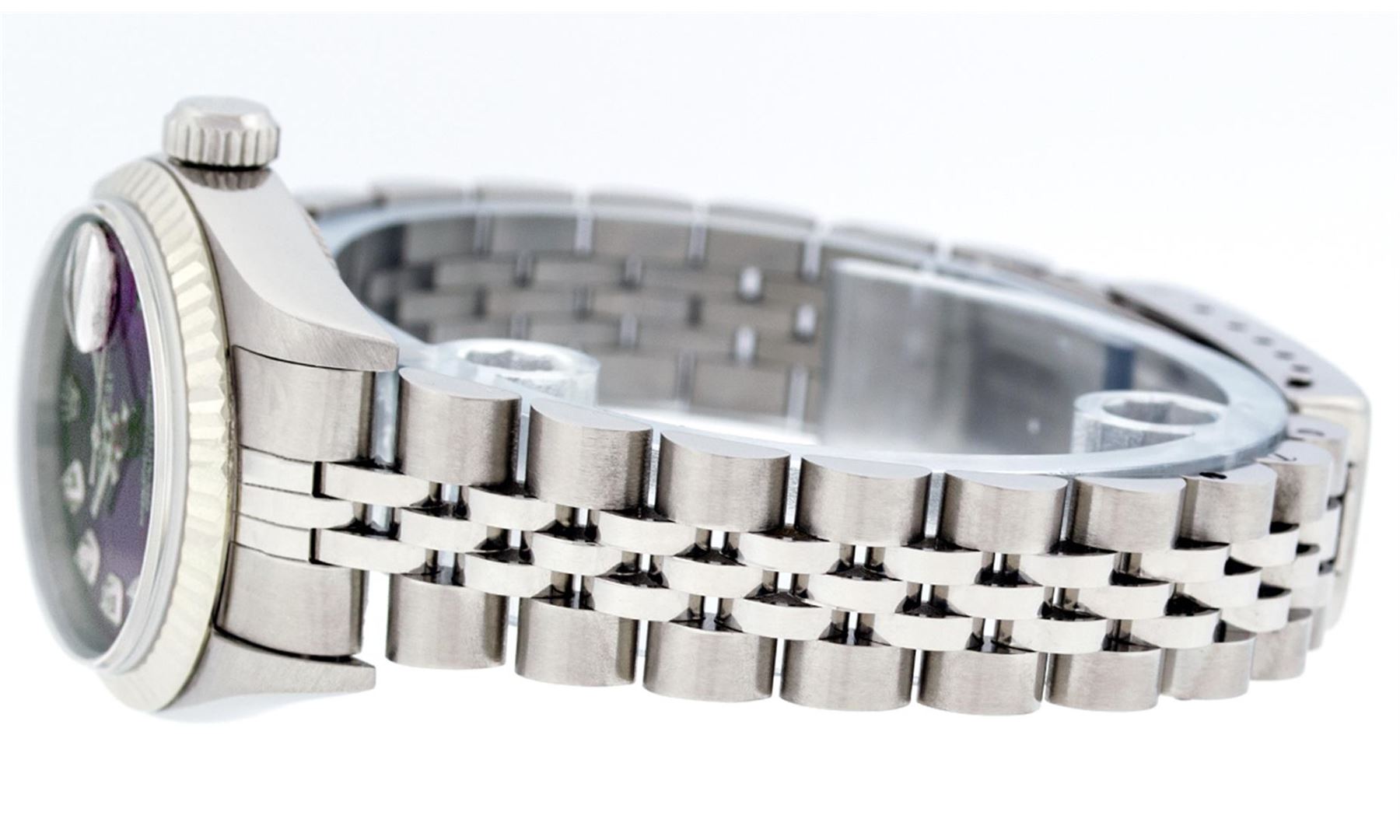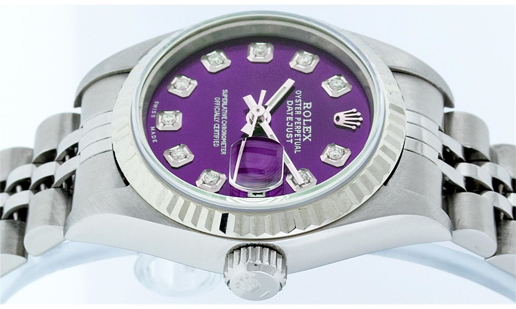 One Ladies Rolex Datejust Polished Bright with Satin Finish, Serviced & Electronically Tested, Stainless Steel Case:26mm, Stainless Steel Crown, Bezel: 18K White Gold Fluted Bezel, Custom Crystal: Synthetic Sapphire Cyclops Lens. Movement: Automatic Winding Movement Caliber 2235. Custom Dial: Refinished Purple Diamond Dial, 10 Diamonds in Dial G To H In Color, Clarity: SI-VS. Date Window: 3 O'clock Position Date Display, Model: No Hole Datejust Quickset. Condition: G-6 Extra Fine. Bracelet: Stainless Steel Jubilee Band. Bright Polish & Satin Finish. 6.0 Inch Length, Adjustable. Standard Clasp, With Rolex Logo. Comes with 6 month warranty.