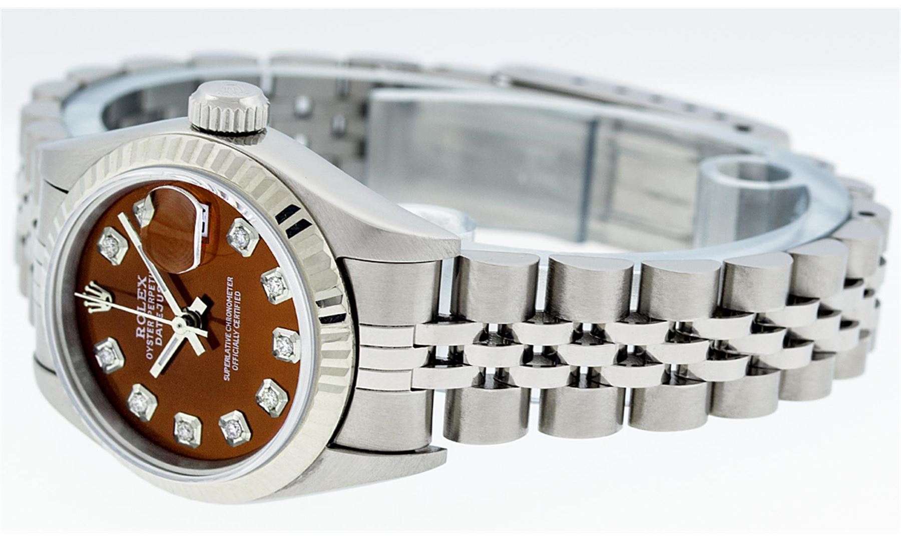 One Ladies Rolex Datejust Polished Bright with Satin Finish, Serviced & Electronically Tested, Stainless Steel Case:26mm, Stainless Steel Crown, Bezel:18K White Gold Fluted Bezel, Custom Crystal: Synthetic Sapphire Cyclops Lens. Movement: Automatic Winding Movement Caliber 2235. Custom Dial: Refinished Brown Diamond Dial, 10 Diamonds in Dial G To H In Color, Clarity: SI-VS. Date Window: 3 O'clock Position Date Display, Model: No Hole Datejust Quickset. Condition: G-6 Extra Fine. Bracelet: Stainless Steel Jubilee Band. Bright Polish & Satin Finish. 6.0 Inch Length, Adjustable. Standard Clasp, With Rolex Logo. Comes with 6 month warranty.