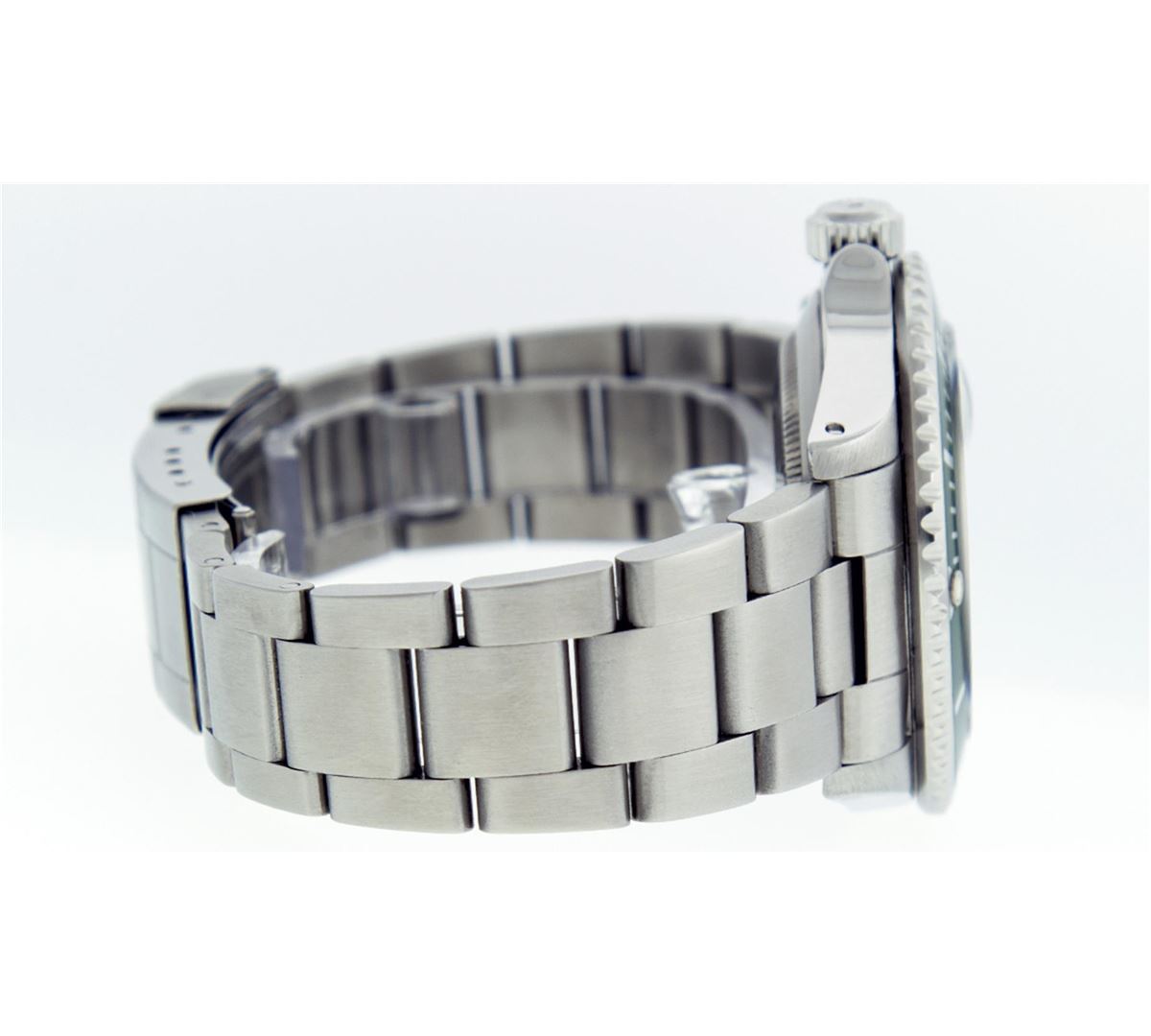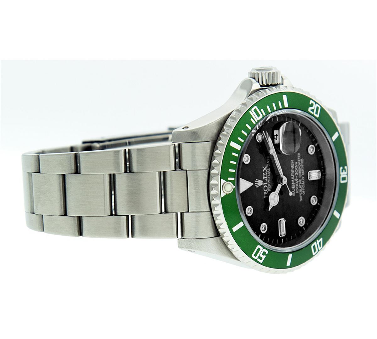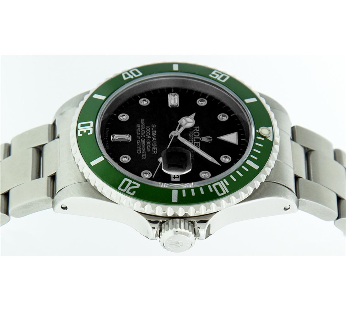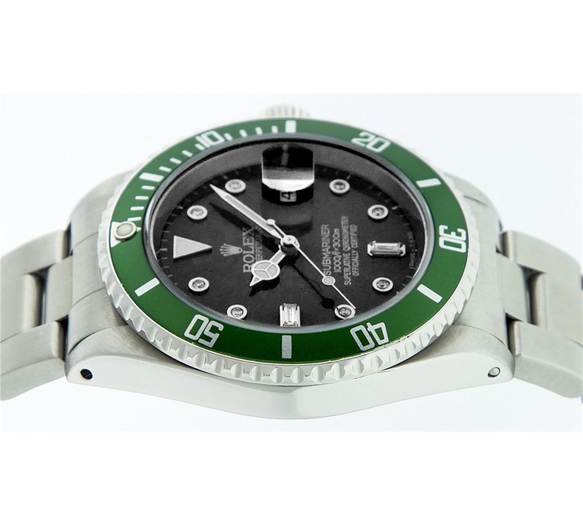 One Mens Rolex Submariner With Date Polished, Serviced & Electronically Tested, Stainless Steel Case:41mm, Stainless Steel Crown, Custom Bezel: Stainless Steel Rotatable Bezel With Green Insert. Crystal: Synthetic Sapphire Cyclops Lens. Movement: Automatic Winding Movement Caliber 3135. Custom Dial: Black Diamond And Baguette Dial, Diamond Count: 8 Diamonds + 2 Baguettes, Color: G To H, Clarity: SI-VS. Date Window: 3 O'Clock Position Date Display, Model: Submariner 16610, Quickset, Condition: G-6 Extra Fine. Bracelet: Stainless Steel Oyster. Bright Polish & Satin Finish. 7.0 Inch Length, Adjustable. Standard Clasp, With Rolex Logo. Comes with 6 month warranty.