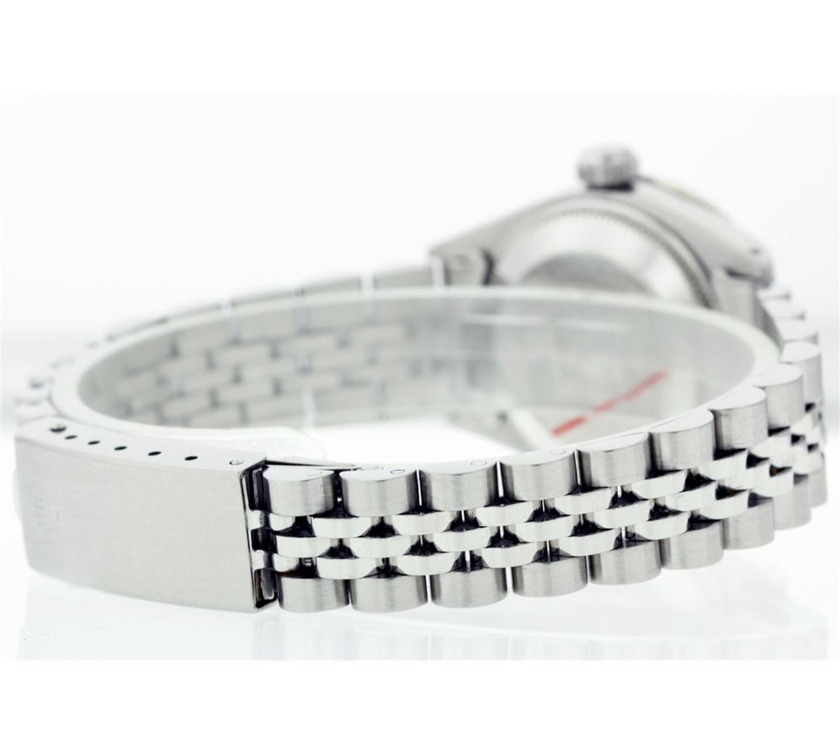 One Ladies Rolex Datejust Polished Bright with Satin Finish, Serviced & Electronically Tested, Stainless Steel Case:26mm, Stainless Steel Crown, Custom Bezel: 18K White Gold Emerald Beadset Diamond Bezel, Diamond + Gem Count: 28 Diamonds + 4 Emeralds Total Weight .70 Carat, Clarity: SI-VS, Color: G to H. Custom Crystal: Synthetic Sapphire Cyclops Lens. Movement: Automatic Winding Movement Caliber 2030. Custom Dial: Refinished Green Vignette With Diamond Hour Markers. Date Window: 3 O'Clock Position Date Display, Quickset, Model: 6917 Condition: G-6 Extra Fine. Bracelet: Stainless Steel Jubilee. Bright Polish & Satin Finish. 5.5 Inch Length, Adjustable. Standard Clasp, With Rolex Logo.