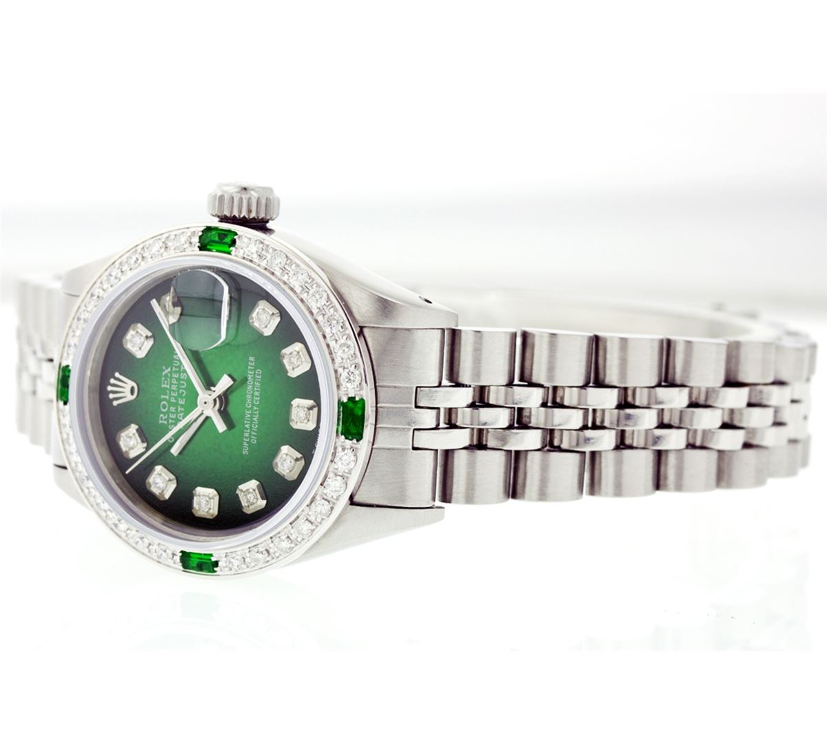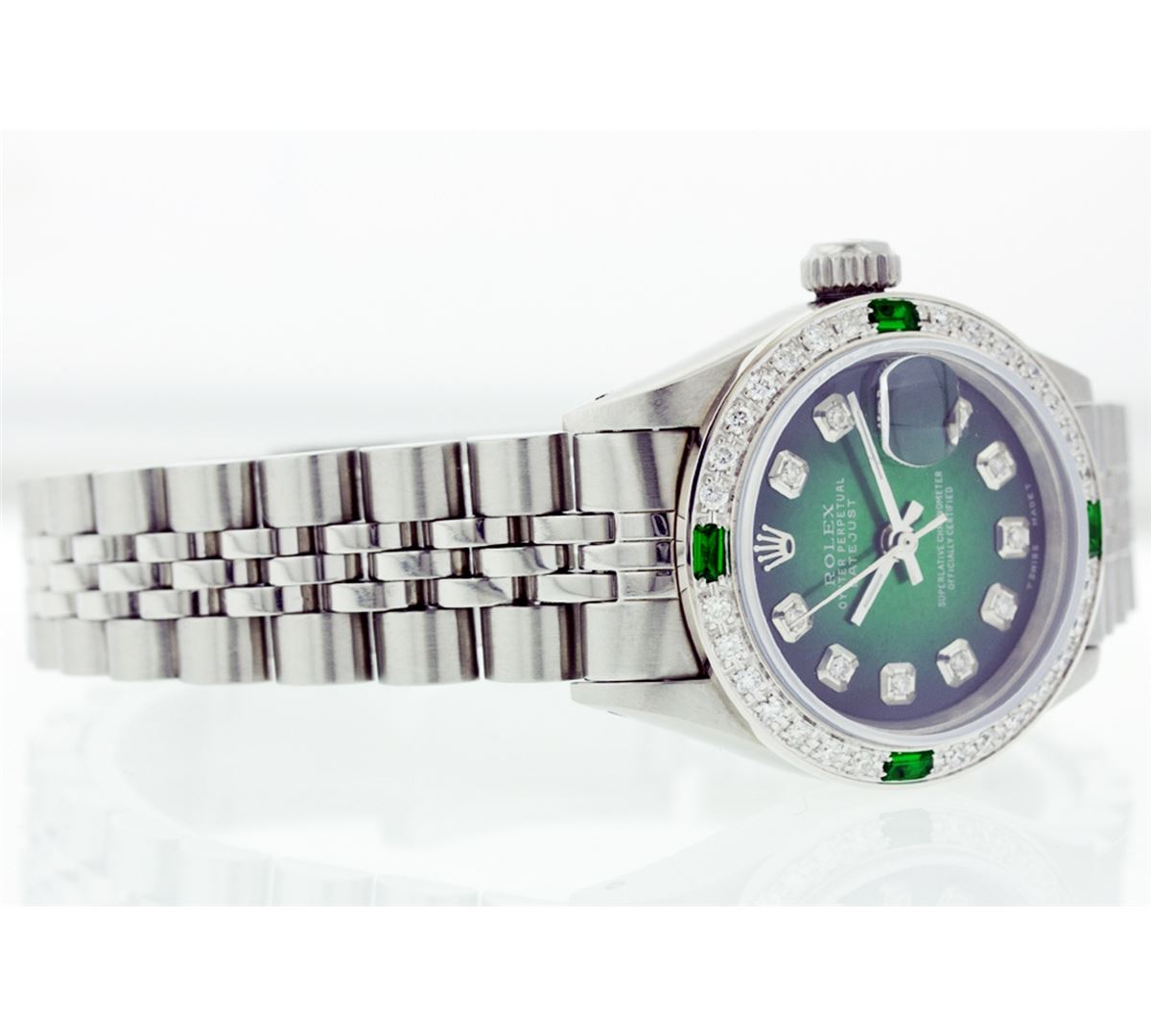 One Ladies Rolex Datejust Polished Bright with Satin Finish, Serviced & Electronically Tested, Stainless Steel Case:26mm, Stainless Steel Crown, Custom Bezel: 18K White Gold Emerald Beadset Diamond Bezel, Diamond + Gem Count: 28 Diamonds + 4 Emeralds Total Weight .70 Carat, Clarity: SI-VS, Color: G to H. Custom Crystal: Synthetic Sapphire Cyclops Lens. Movement: Automatic Winding Movement Caliber 2030. Custom Dial: Refinished Green Vignette With Diamond Hour Markers. Date Window: 3 O'Clock Position Date Display, Quickset, Model: 6917 Condition: G-6 Extra Fine. Bracelet: Stainless Steel Jubilee. Bright Polish & Satin Finish. 5.5 Inch Length, Adjustable. Standard Clasp, With Rolex Logo.