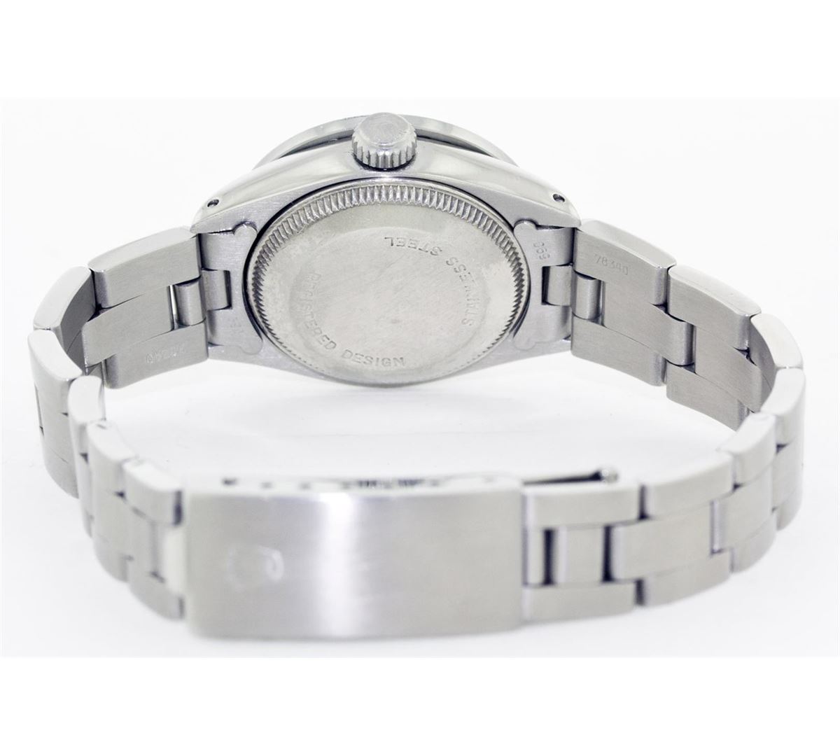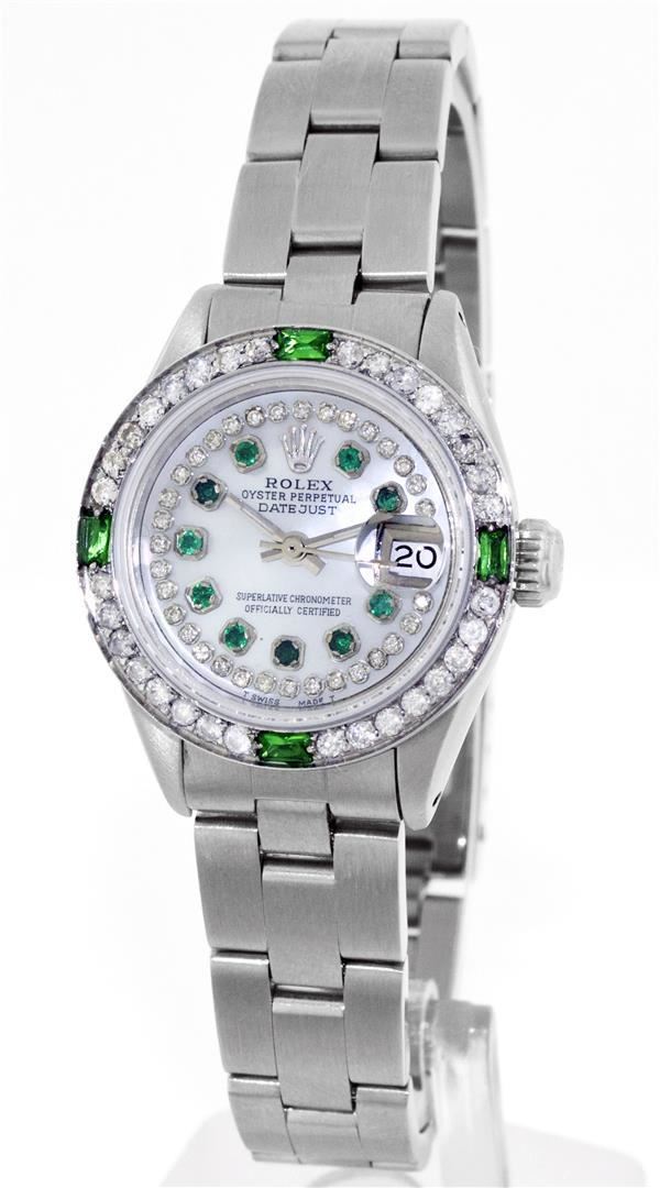 One Ladies Rolex Datejust Polished Bright with Satin Finish, Serviced & Electronically Tested, Stainless Steel Case:26mm, Stainless Steel Crown, Custom Bezel: 18K White Gold Emerald Beadset Diamond Bezel, Diamond Count: 28 Diamonds + 4 Emeralds Total Weight .70 Carat, Clarity: SI-VS, Color: G to H. Custom Crystal: Synthetic Sapphire Cyclops Lens. Movement: Automatic Winding Movement Caliber 2030. Custom Dial: Mother Of Pearl Emerald String Diamond Dial, Diamond Count: 10 Emeralds + 33 Diamonds In Dial, Clarity: SI-VS, Color: G to H. Date Window: 3 O'Clock Position Date Display, Non Quickset, Model: 6917 Condition: G-6 Extra Fine. Bracelet: Stainless Steel Oyster Band. Bright Polish & Satin Finish. 5.5 Inch Length, Adjustable. Standard Clasp, With Rolex Logo.