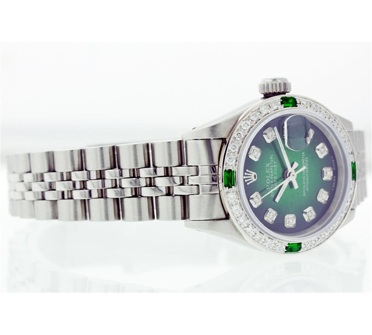 One Ladies Rolex Datejust Polished Bright with Satin Finish, Serviced & Electronically Tested, Stainless Steel Case:26mm, Stainless Steel Crown, Custom Bezel: 18K White Gold Emerald Beadset Diamond Bezel, Diamond + Gem Count: 28 Diamonds + 4 Emeralds Total Weight .70 Carat, Clarity: SI-VS, Color: G to H. Custom Crystal: Synthetic Sapphire Cyclops Lens. Movement: Automatic Winding Movement Caliber 2030. Custom Dial: Refinished Green Vignette With Diamond Hour Markers. Date Window: 3 O'Clock Position Date Display, Non Quickset, Model: 6917 Condition: G-6 Extra Fine. Bracelet: Stainless Steel Jubilee. Bright Polish & Satin Finish. 5.5 Inch Length, Adjustable. Standard Clasp, With Rolex Logo.