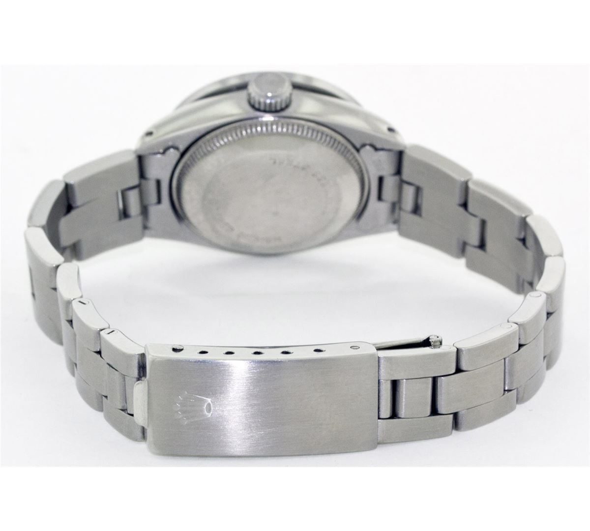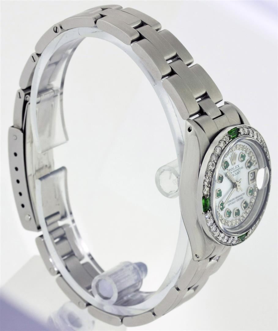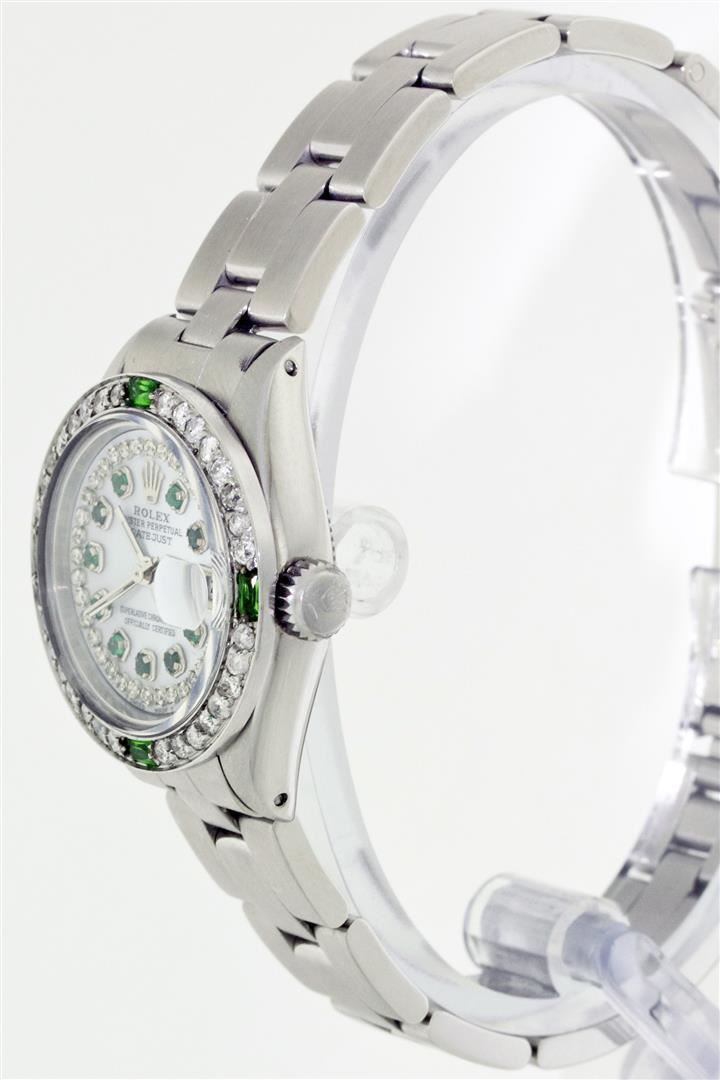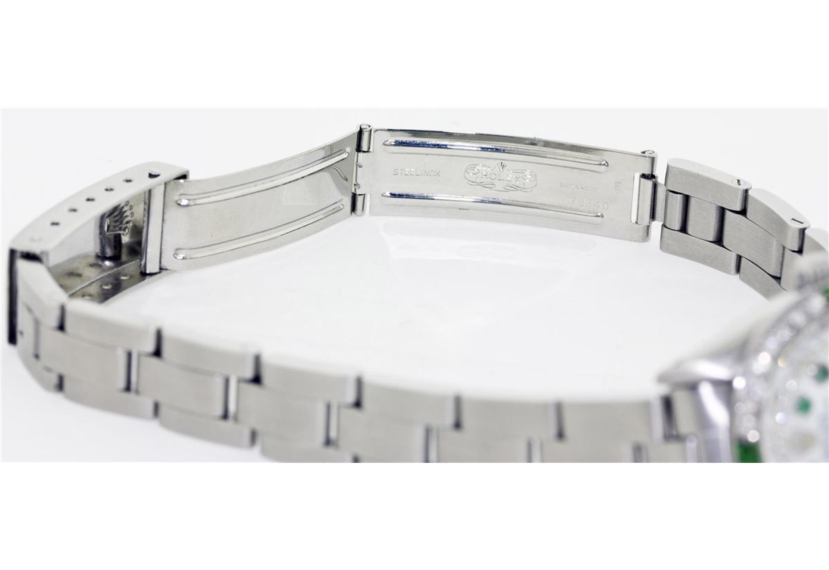 One Ladies Rolex Datejust Polished Bright with Satin Finish, Serviced & Electronically Tested, Stainless Steel Case:26mm, Stainless Steel Crown, Custom Bezel: 18K White Gold Emerald Beadset Diamond Bezel, Diamond Count: 28 Diamonds + 4 Emeralds Total Weight .70 Carat, Clarity: SI-VS, Color: G to H. Custom Crystal: Synthetic Sapphire Cyclops Lens. Movement: Automatic Winding Movement Caliber 2030. Custom Dial: Mother Of Pearl Emerald String Diamond Dial, Diamond Count: 10 Emeralds + 33 Diamonds In Dial, Clarity: SI-VS, Color: G to H. Date Window: 3 O'Clock Position Date Display, Non Quickset, Model: 6917 Condition: G-6 Extra Fine. Bracelet: Stainless Steel Oyster Band. Bright Polish & Satin Finish. 5.5 Inch Length, Adjustable. Standard Clasp, With Rolex Logo.
