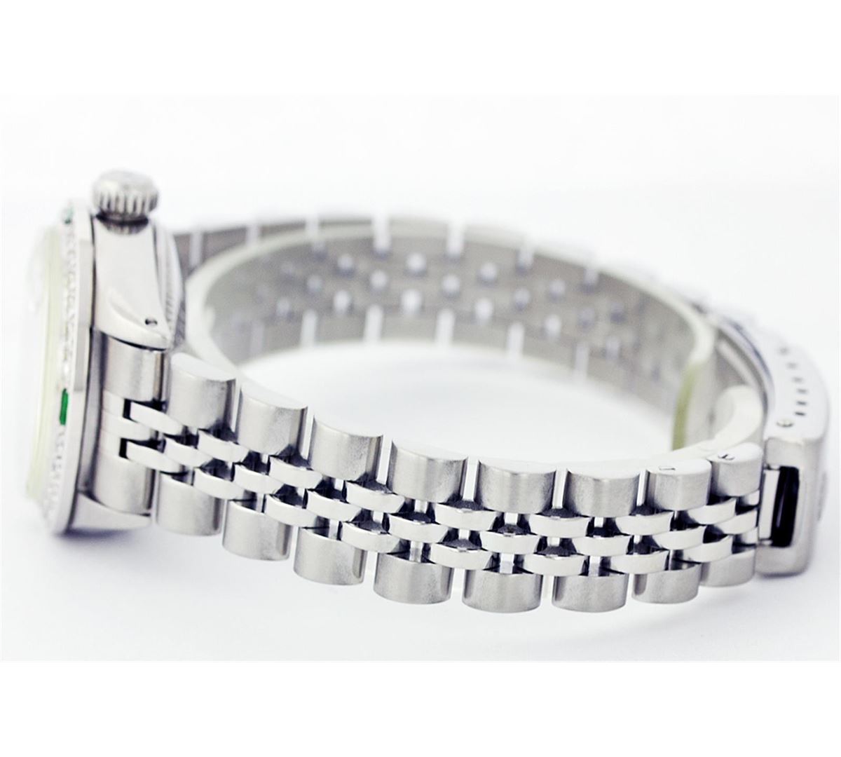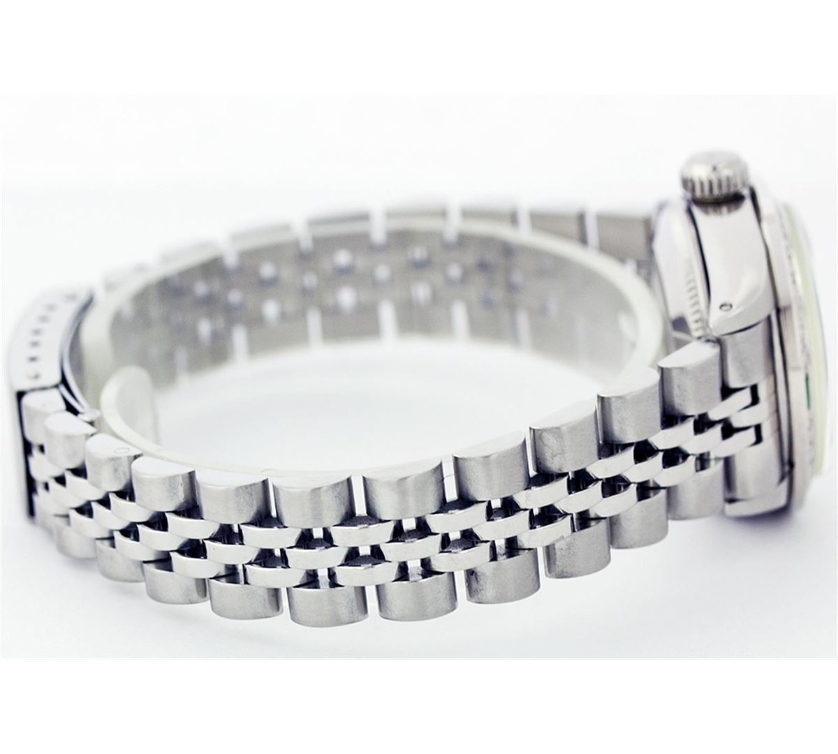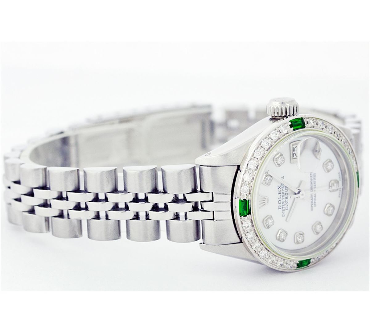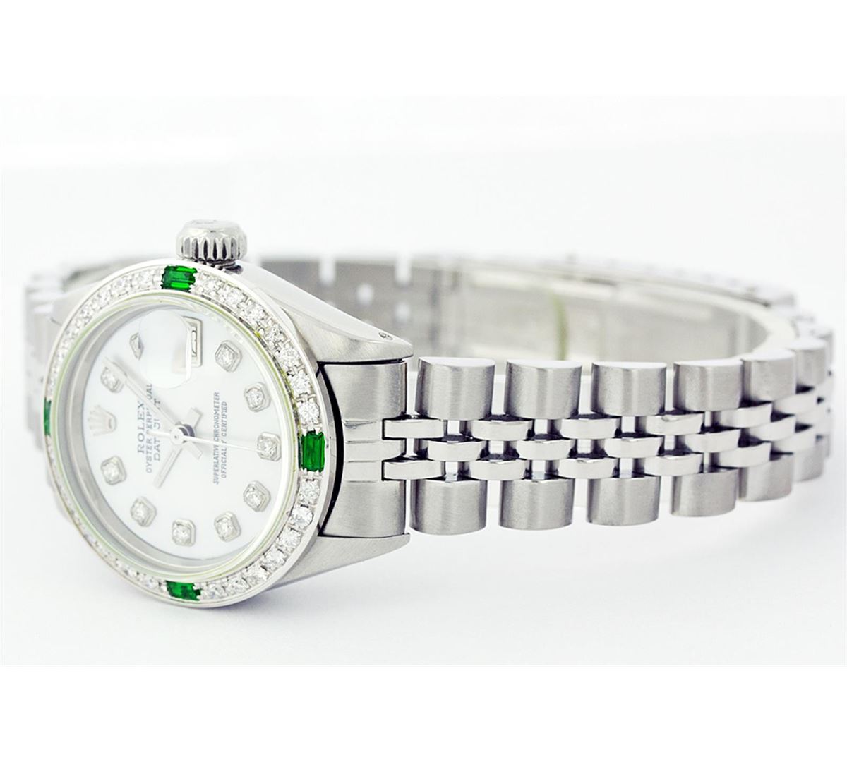 One Ladies Rolex Datejust Polished Bright with Satin Finish, Serviced & Electronically Tested, Stainless Steel Case:26mm, Stainless Steel Crown, Custom Bezel: 18K White Gold Emerald Beadset Diamond Bezel, Diamond + Gem Count: 28 Diamonds + 4 Emeralds Total Weight .70 Carat, Clarity: SI-VS, Color: G to H. Custom Crystal: Synthetic Sapphire Cyclops Lens. Movement: Automatic Winding Movement Caliber 2030. Custom Dial: Refinished Mother Of Pearl With Diamond Hour Markers, Diamond Count: 10 Diamonds, Clarity: SI-VS, Color: G to H. Date Window: 3 O'Clock Position Date Display, Non Quickset, Model: 6917 Condition: G-6 Extra Fine. Bracelet: Stainless Steel Jubilee. Bright Polish & Satin Finish. 5.5 Inch Length, Adjustable. Standard Clasp, With Rolex Logo.