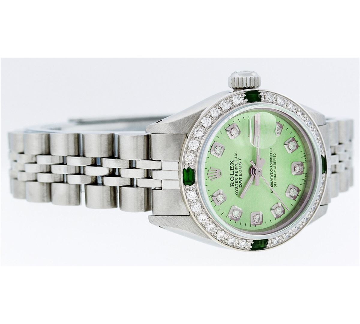 Ladies Rolex Datejust Polished Bright with Satin Finish, Serviced & Electronically Tested, Stainless Steel Case:26mm, Stainless Steel Crown, Custom Bezel: 18K White Gold Emerald Beadset Diamond Bezel, Diamond + Gem Count: 28 Diamonds + 4 Emerald. Total Weight .70 Carat, Clarity: SI-VS, Color: G to H. Custom Crystal: Synthetic Sapphire Cyclops Lens. Movement: Automatic Winding Movement Caliber 2030. Custom Dial: Refinished Ice Green With Diamond Hour Markers. Diamond Count: 10 Diamonds, Color: G To H, Clarity: SI-VS. Date Window: 3 O'Clock Position Date Display, Model: Datejust. Condition: G-6 Extra Fine. Bracelet: Stainless Steel Jubilee. Bright Polish & Satin Finish. 6.0 Inch Length, Adjustable. Standard Clasp, With Rolex Logo. Comes with 6 month warranty.