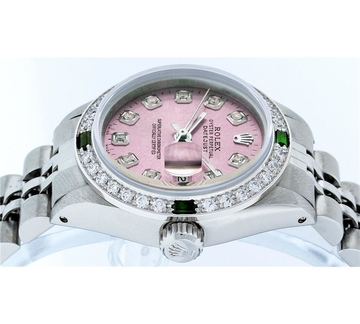 Ladies Rolex Datejust Polished Bright with Satin Finish, Serviced & Electronically Tested, Stainless Steel Case:26mm, Stainless Steel Crown, Custom Bezel: 18K White Gold Emerald Beadset Diamond Bezel, Diamond + Gem Count: 28 Diamonds + 4 Emerald. Total Weight .70 Carat, Clarity: SI-VS, Color: G to H. Custom Crystal: Synthetic Sapphire Cyclops Lens. Movement: Automatic Winding Movement Caliber 2030. Custom Dial: Refinished Pink With Diamond Hour Markers. Diamond Count: 10 Diamonds, Color: G To H, Clarity: SI-VS. Date Window: 3 O'Clock Position Date Display, Model: Datejust. Condition: G-6 Extra Fine. Bracelet: Stainless Steel Jubilee. Bright Polish & Satin Finish. 6.0 Inch Length, Adjustable. Standard Clasp, With Rolex Logo. Comes with 6 month warranty.
