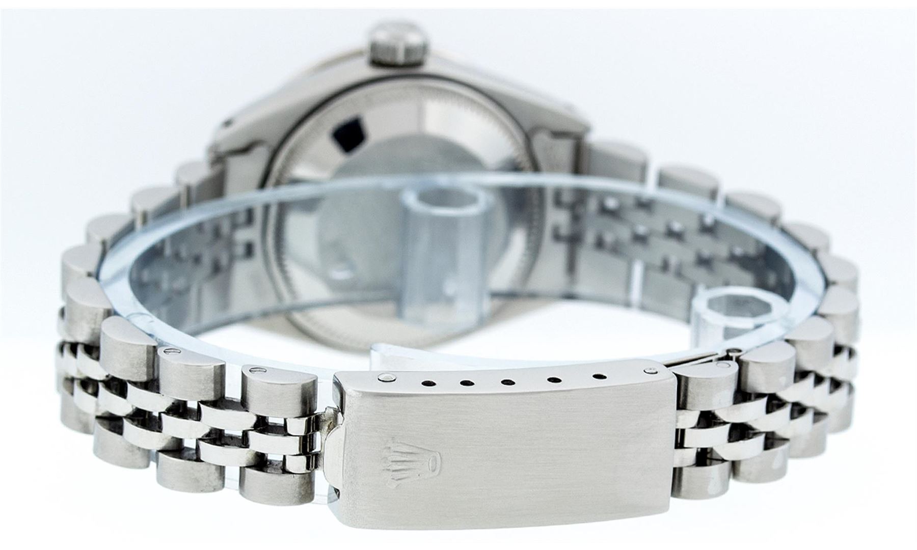 Ladies Rolex Datejust Polished Bright with Satin Finish, Serviced & Electronically Tested, Stainless Steel Case:26mm, Stainless Steel Crown, Custom Bezel: 18K White Gold Emerald Beadset Diamond Bezel, Diamond + Gem Count: 28 Diamonds + 4 Emerald. Total Weight .70 Carat, Clarity: SI-VS, Color: G to H. Custom Crystal: Synthetic Sapphire Cyclops Lens. Movement: Automatic Winding Movement Caliber 2030. Custom Dial: Refinished Ice Green With Diamond Hour Markers. Diamond Count: 10 Diamonds, Color: G To H, Clarity: SI-VS. Date Window: 3 O'Clock Position Date Display, Model: Datejust. Condition: G-6 Extra Fine. Bracelet: Stainless Steel Jubilee. Bright Polish & Satin Finish. 6.0 Inch Length, Adjustable. Standard Clasp, With Rolex Logo. Comes with 6 month warranty.