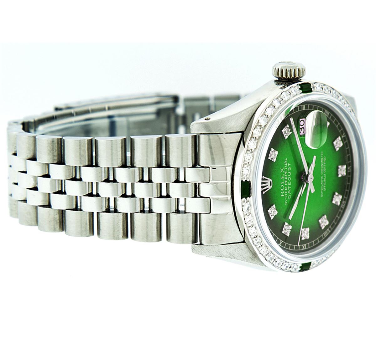 One Mens Rolex Datejust Polished, Serviced & Electronically Tested, Stainless Steel Case:36mm, Stainless Steel Crown, Custom Bezel: 18K White Gold Emerald Beadset Diamond Bezel, Diamond + Gem Count: 36 Diamonds + 4 Emeralds. Total Weight 1.00 Carat, Clarity: SI-VS, Color: G to H. Custom Crystal: Synthetic Sapphire Cyclops Lens. Movement: Automatic Winding Movement Caliber 3035. Custom Dial: Green Vignette With Diamond Hour Markers Square Roman Track, 10 Diamond Dial Square Setting. G To H In Color, Clarity: SI-VS. Date Window: 3 O'Clock Position Date Display, Quickset, Model: Datejust. Condition: G-6 Extra Fine. Bracelet: Stainless Steel Jubilee. Bright Polish & Satin Finish. 7.0 Inch Length, Adjustable. Standard Clasp, With Rolex Logo. Comes with 6 month warranty.