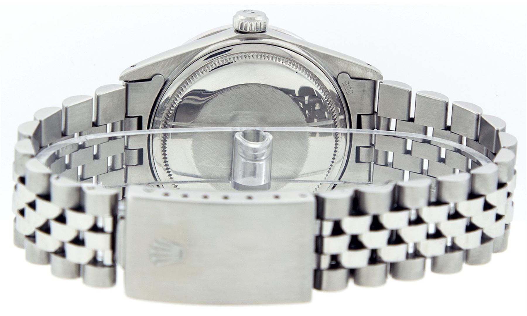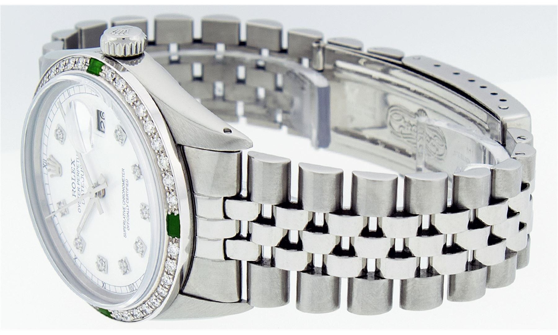One Mens Rolex Datejust Polished Bright with Satin Finish, Serviced & Electronically Tested, Stainless Steel Case:36mm, Stainless Steel Crown, Custom Bezel: 18K White Gold Emerald Beadset Diamond Bezel, Diamond + Gem Count: 36 Diamonds + 4 Emeralds. Total Weight 1.00 Carat, Clarity: Si-VS, Color: G to H. Custom Crystal: Synthetic Sapphire Cyclops Lens. Movement: Automatic Winding Movement Caliber 3035. Custom Dial: White Diamond Dial With Square Roman Track, Diamond Count: 10 Diamonds Square Setting, Color: G to H, Clarity: SI-VS.. Date Window: 3 O'Clock Position Date Display, Quickset, Model: Datejust. Condition: G-6 Extra Fine. Bracelet: Stainless Steel Jubilee. Bright Polish & Satin Finish. 7.0 Inch Length, Adjustable. Standard Clasp, With Rolex Logo. Comes with 6 month warranty.