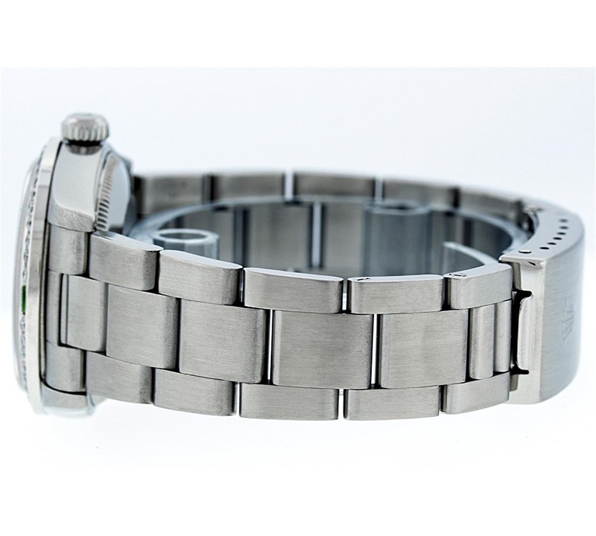 One Midsize Stainless Steel Rolex Datejust Polished, Serviced & Electronically Tested, Stainless Steel Case Case:31mm, Stainless Steel Crown, Custom Bezel: 18K White Gold Emerald Beadset Bezel, Diamond Count: 40 Diamonds + 4 Emeralds, Total Weight: 1 Carat, Color: G To H, Clarity: VS2-SI1. Custom Crystal: Synthetic Sapphire Cyclops Lens. Movement: Automatic Winding Movement Caliber 2235. Custom Dial: Black String Diamond Dial VVS. Color: G to H, Clarity: VVS, Date Window: 3 O'Clock Position Date Display, Quickset, Model: Midsize Datejust. Condition: G-6 Extra Fine. Bracelet: Stainless Steel Oyster Band. Bright Polish. 6.0 Inch Length, Adjustable. Standard Clasp, With Rolex Logo.