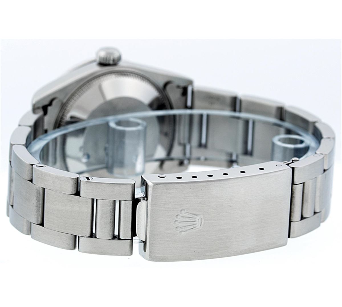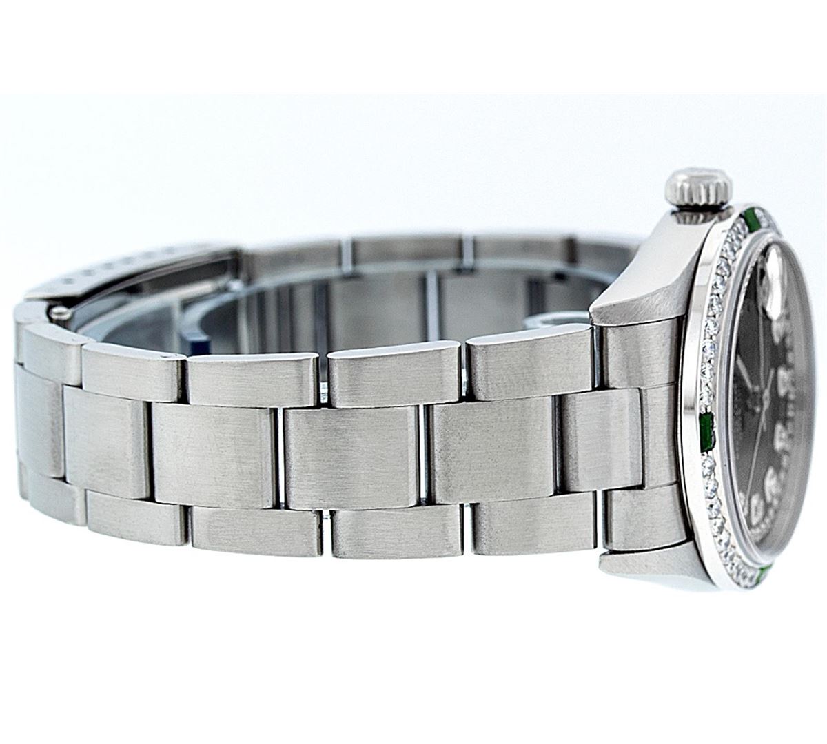 One Midsize Stainless Steel Rolex Datejust Polished, Serviced & Electronically Tested, Stainless Steel Case Case:31mm, Stainless Steel Crown, Custom Bezel: 18K White Gold Emerald Beadset Bezel, Diamond Count: 40 Diamonds + 4 Emeralds, Total Weight: 1 Carat, Color: G To H, Clarity: VS2-SI1. Custom Crystal: Synthetic Sapphire Cyclops Lens. Movement: Automatic Winding Movement Caliber 2235. Custom Dial: Black String Diamond Dial VVS. Color: G to H, Clarity: VVS, Date Window: 3 O'Clock Position Date Display, Quickset, Model: Midsize Datejust. Condition: G-6 Extra Fine. Bracelet: Stainless Steel Oyster Band. Bright Polish. 6.0 Inch Length, Adjustable. Standard Clasp, With Rolex Logo.