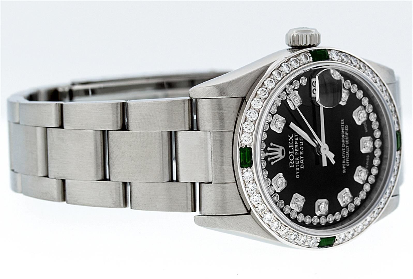 One Midsize Stainless Steel Rolex Datejust Polished, Serviced & Electronically Tested, Stainless Steel Case Case:31mm, Stainless Steel Crown, Custom Bezel: 18K White Gold Emerald Beadset Bezel, Diamond Count: 40 Diamonds + 4 Emeralds, Total Weight: 1 Carat, Color: G To H, Clarity: VS2-SI1. Custom Crystal: Synthetic Sapphire Cyclops Lens. Movement: Automatic Winding Movement Caliber 2235. Custom Dial: Black String Diamond Dial VVS. Color: G to H, Clarity: VVS, Date Window: 3 O'Clock Position Date Display, Quickset, Model: Midsize Datejust. Condition: G-6 Extra Fine. Bracelet: Stainless Steel Oyster Band. Bright Polish. 6.0 Inch Length, Adjustable. Standard Clasp, With Rolex Logo.