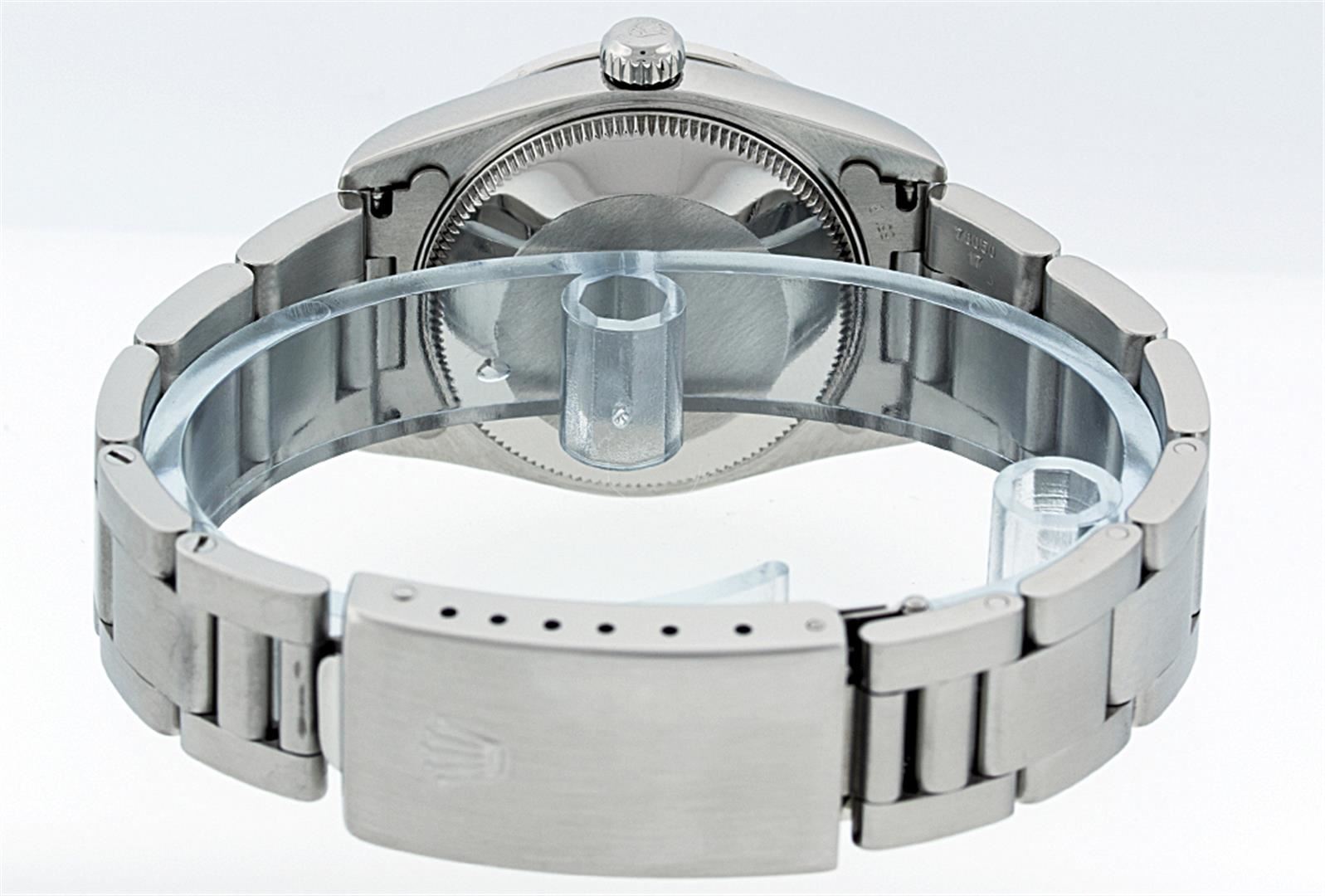 One Midsize Stainless Steel Rolex Datejust Polished, Serviced & Electronically Tested, Stainless Steel Case Case:31mm, Stainless Steel Crown, Custom Bezel: 18K White Gold Emerald Beadset Bezel, Diamond Count: 40 Diamonds + 4 Emeralds, Total Weight: 1 Carat, Color: G To H, Clarity: VS2-SI1. Custom Crystal: Synthetic Sapphire Cyclops Lens. Movement: Automatic Winding Movement Caliber 2235. Custom Dial: Black String Diamond Dial VVS. Color: G to H, Clarity: VVS, Date Window: 3 O'Clock Position Date Display, Quickset, Model: Midsize Datejust. Condition: G-6 Extra Fine. Bracelet: Stainless Steel Oyster Band. Bright Polish. 6.0 Inch Length, Adjustable. Standard Clasp, With Rolex Logo.