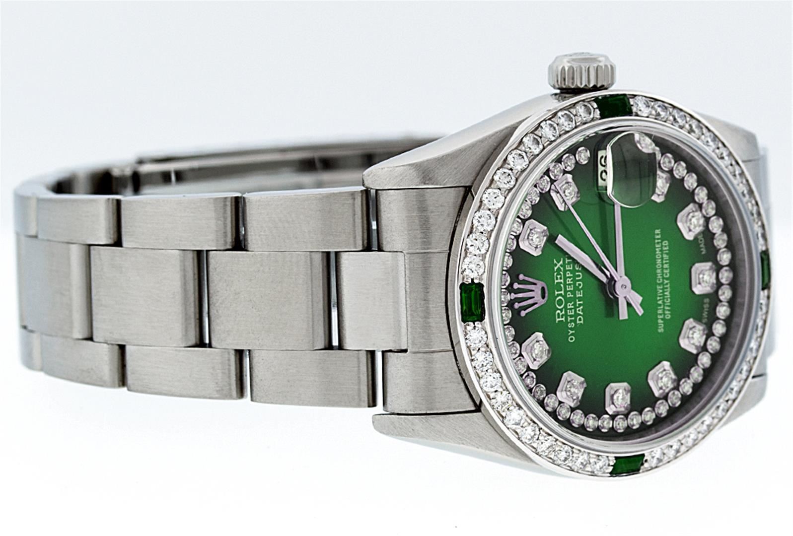 One Midsize Stainless Steel Rolex Datejust Polished, Serviced & Electronically Tested, Stainless Steel Case Case:31mm, Stainless Steel Crown, Custom Bezel: 18K White Gold Emerald Beadset Bezel, Diamond Count: 40 Diamonds + 4 Emeralds, Total Weight: 1 Carat, Color: G To H, Clarity: VS2-SI1. Custom Crystal: Synthetic Sapphire Cyclops Lens. Movement: Automatic Winding Movement Caliber 2235. Custom Dial: Green Vignette Diamond Dial VVS. Color: G to H, Clarity: VVS, Date Window: 3 O'Clock Position Date Display, Quickset, Model: Midsize Datejust. Condition: G-6 Extra Fine The Watch Is In Very Good Condition Free Of All Scratches And Dents. Bracelet: Stainless Steel Oyster Band. Bright Polish. 6.0 Inch Length, Adjustable. Standard Clasp, With Rolex Logo. Comes with 6 month warranty.