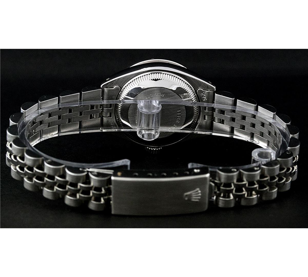 One Ladies Rolex Datejust Polished Bright with Satin Finish, Serviced & Electronically Tested, Stainless Steel Case:26mm, Stainless Steel Crown, Custom Bezel: 18K White Gold Emerald Beadset Diamond Bezel, Diamond + Gem Count: 28 Diamonds + 4 Emeralds Total Weight .70 Carat, Clarity: SI-VS, Color: G to H. Custom Crystal: Synthetic Sapphire Cyclops Lens. Movement: Automatic Winding Movement Caliber 2030. Custom Dial: Refinished Green Vignette With Diamond Hour Markers. Date Window: 3 O'Clock Position Date Display, Non Quickset, Model: 6917 Condition: G-6 Extra Fine. Bracelet: Stainless Steel Jubilee. Bright Polish & Satin Finish. 5.5 Inch Length, Adjustable. Standard Clasp, With Rolex Logo.