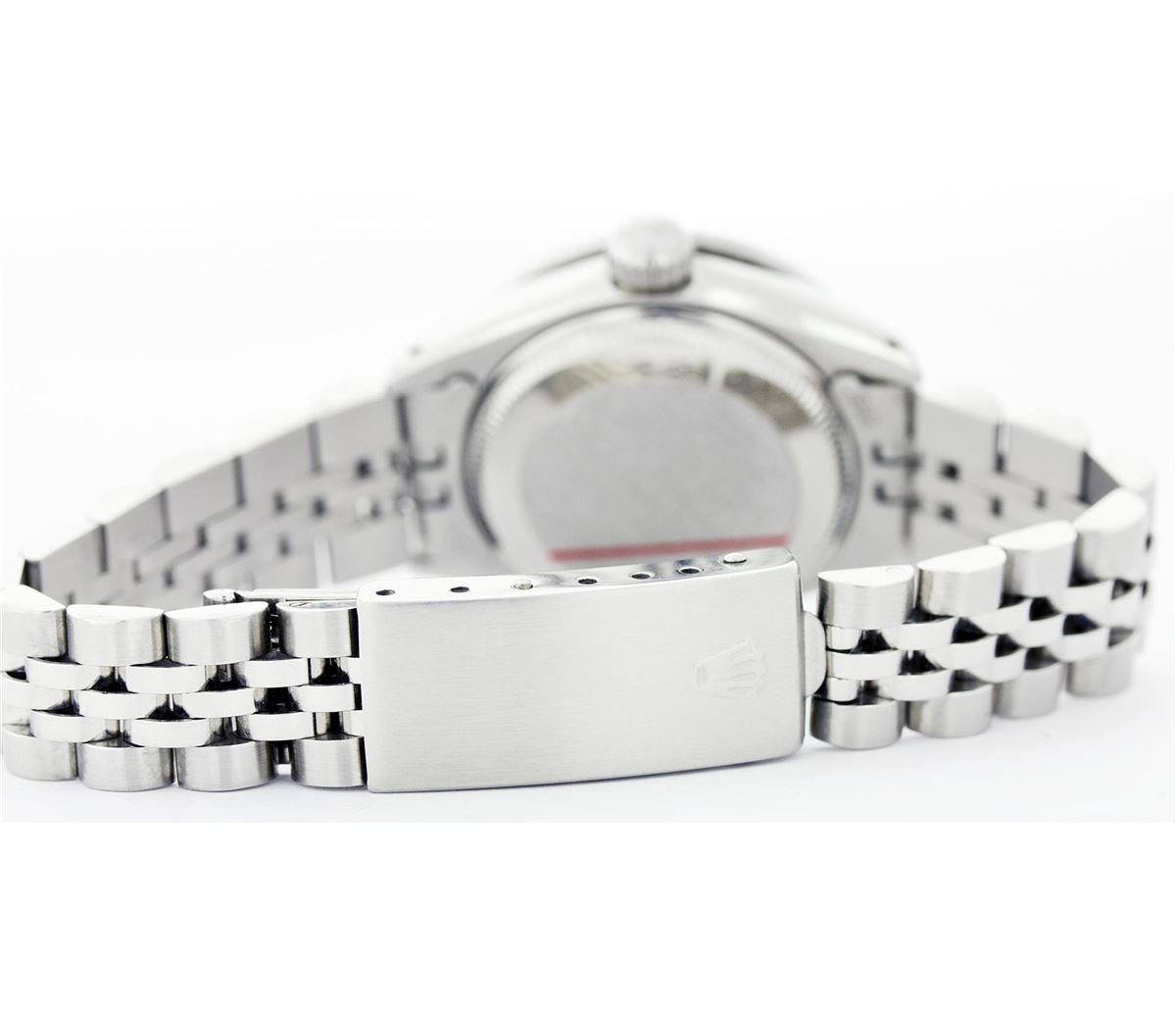 One Ladies Rolex Datejust Polished Bright with Satin Finish, Serviced & Electronically Tested, Stainless Steel Case With Diamond Lugs, Clarity: SI-VS, Color: G to H Case Size:26mm, Stainless Steel Crown, Custom Bezel: 18K White Gold Ruby Beadset Diamond Bezel, Diamond Count: 28 Diamonds + 4 Rubies Total Weight .70 Carat, Clarity: SI-VS, Color: G to H. Custom Crystal: Synthetic Sapphire Cyclops Lens. Movement: Automatic Winding Movement Caliber 2030. Custom Dial: Refinished Pink Mother Of Pearl With Diamond Hour Markers, Diamond Count: 10 Diamonds, Clarity: SI-VS, to H. Date Window: 3 O'Clock Position Date Display, Quickset, Model: 6917 Condition: G-6 Extra Fine. Bracelet: Stainless Steel Jubilee. Bright Polish & Satin Finish. 5.5 Inch Length, Adjustable. Standard Clasp, With Rolex Logo.