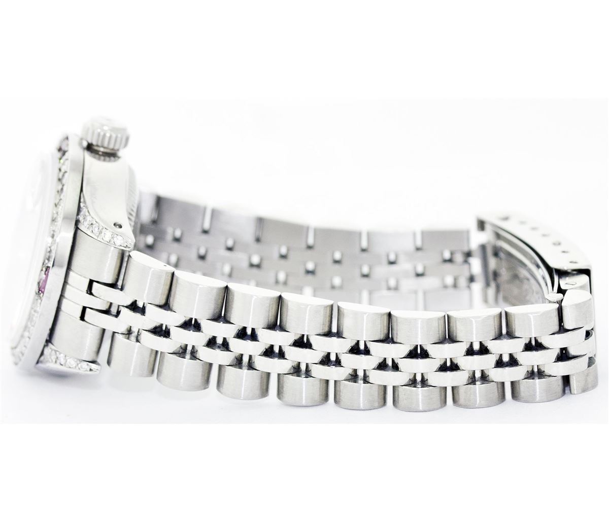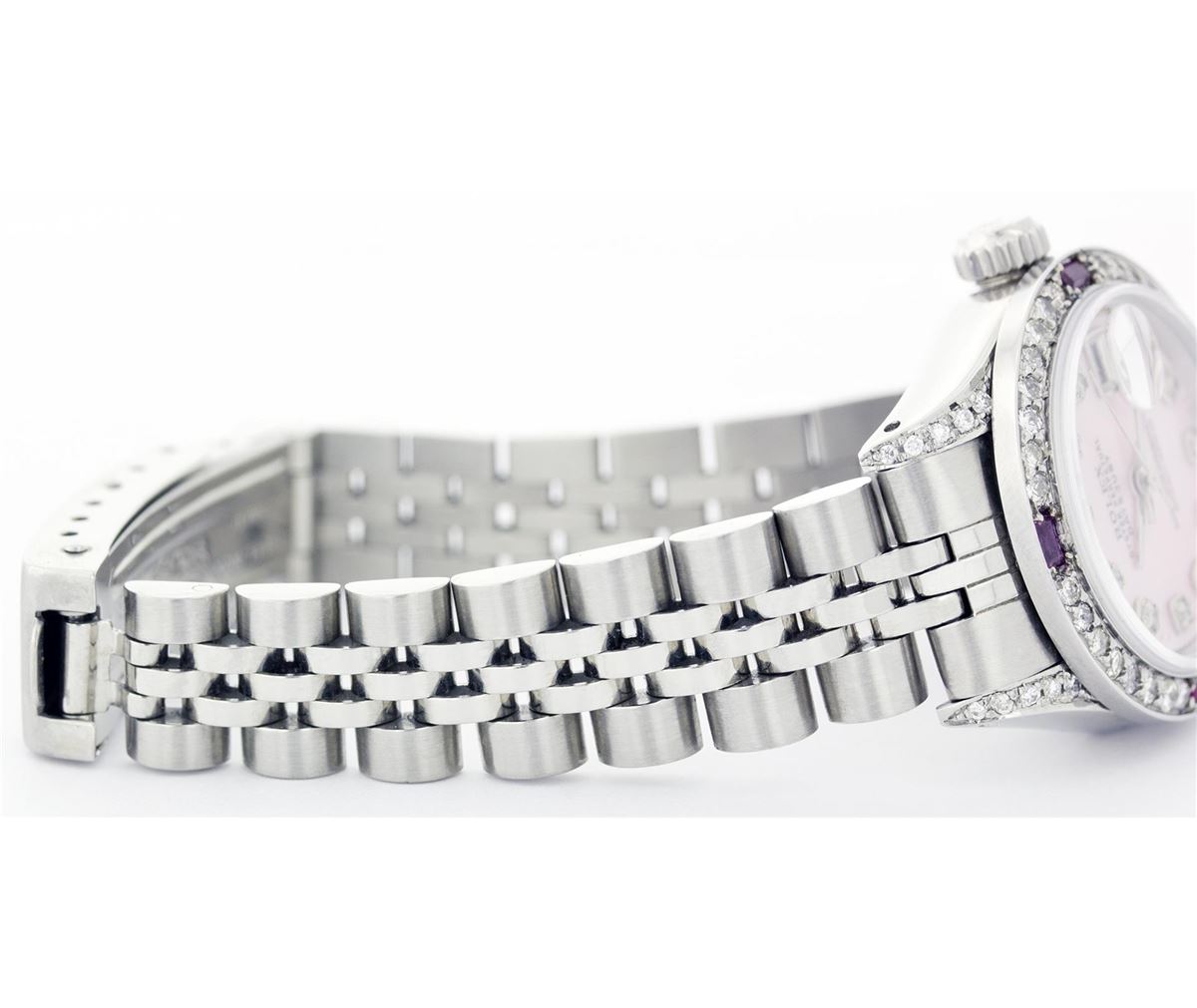One Ladies Rolex Datejust Polished Bright with Satin Finish, Serviced & Electronically Tested, Stainless Steel Case With Diamond Lugs, Clarity: SI-VS, Color: G to H Case Size:26mm, Stainless Steel Crown, Custom Bezel: 18K White Gold Ruby Beadset Diamond Bezel, Diamond Count: 28 Diamonds + 4 Rubies Total Weight .70 Carat, Clarity: SI-VS, Color: G to H. Custom Crystal: Synthetic Sapphire Cyclops Lens. Movement: Automatic Winding Movement Caliber 2030. Custom Dial: Refinished Pink Mother Of Pearl With Diamond Hour Markers, Diamond Count: 10 Diamonds, Clarity: SI-VS, to H. Date Window: 3 O'Clock Position Date Display, Non Quickset, Model: 6917 Condition: G-6 Extra Fine. Bracelet: Stainless Steel Jubilee. Bright Polish & Satin Finish. 5.5 Inch Length, Adjustable. Standard Clasp, With Rolex Logo.