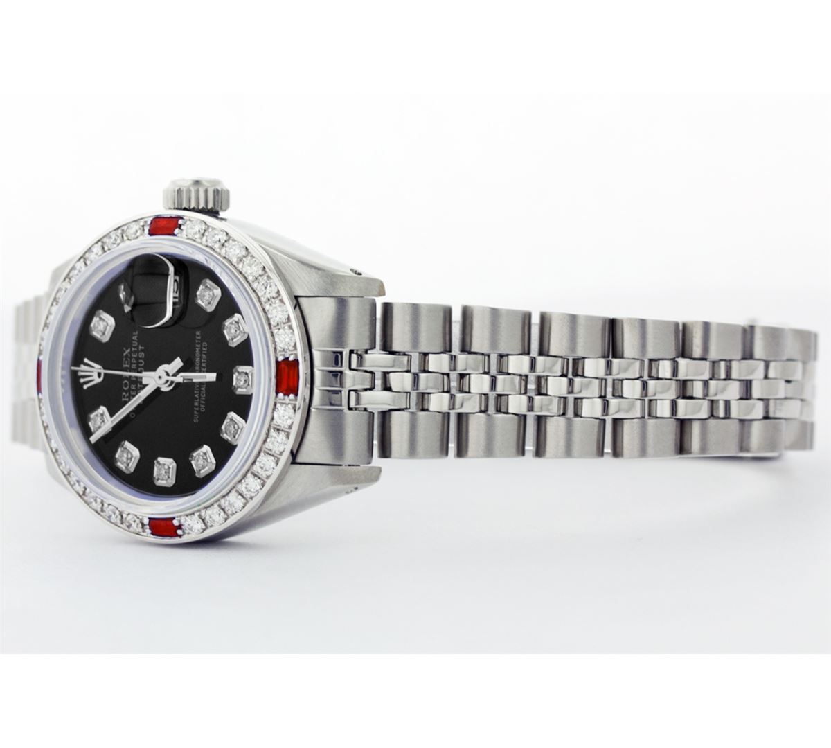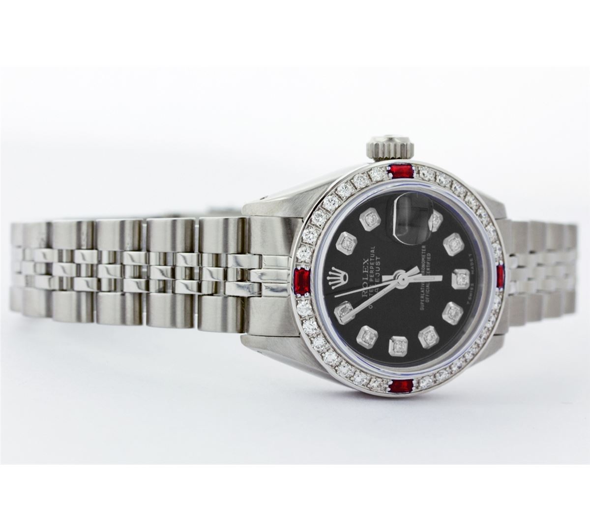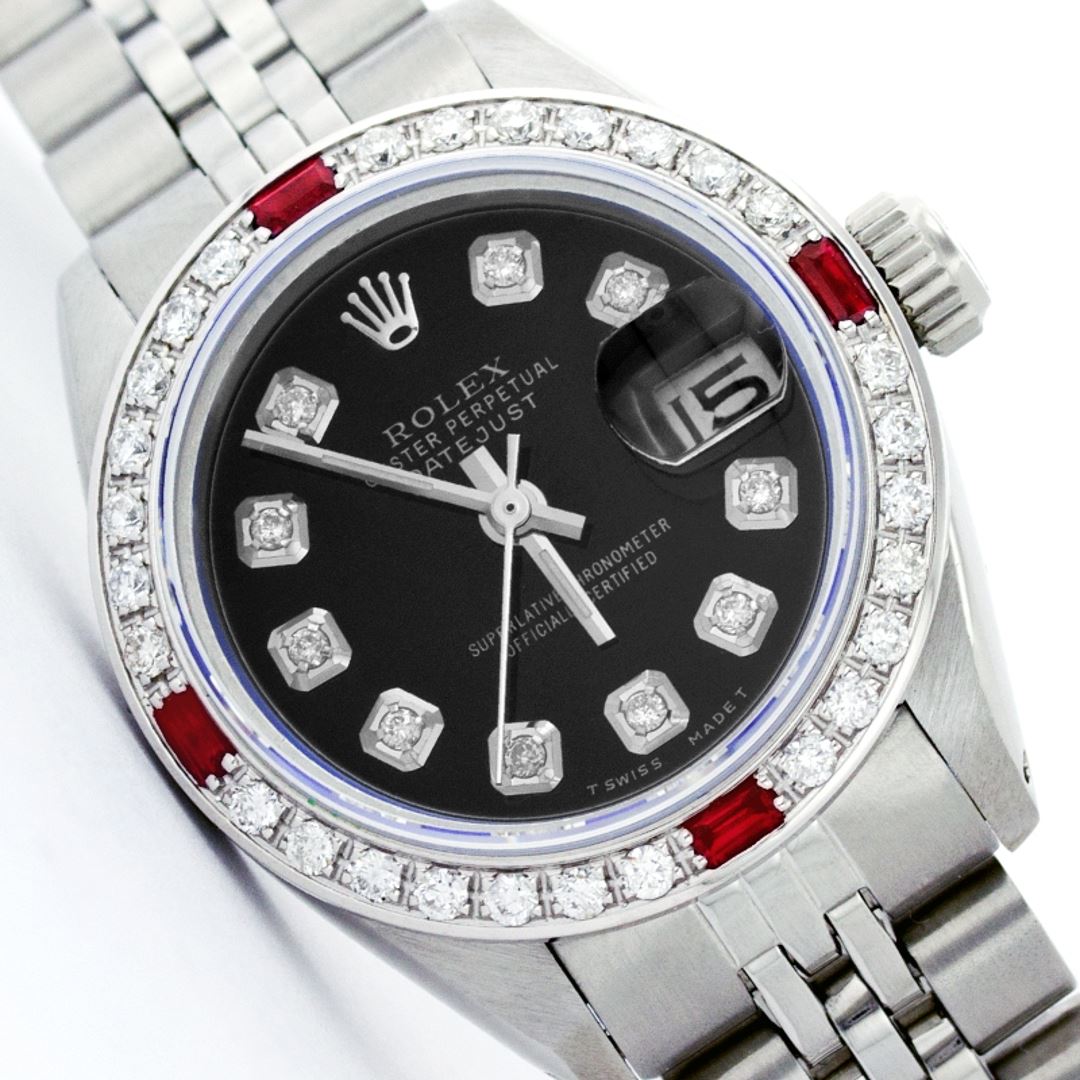 One Ladies Rolex Datejust Polished Bright with Satin Finish, Serviced & Electronically Tested, Stainless Steel Case:26mm, Stainless Steel Crown, Custom Bezel: 18K White Gold Ruby Beadset Diamond Bezel, Diamond Count: 28 Diamonds + 4 Rubies Total Weight .70 Carat, Clarity: SI-VS, Color: G to H. Custom Crystal: Synthetic Sapphire Cyclops Lens. Movement: Automatic Winding Movement Caliber 2030. Custom Dial: Black Dial with Diamond Hour Markers. Clarity: SI-VS, Color: G to H. Date Window: 3 O'Clock Position Date Display, Model: 6917 Condition: G-6 Extra Fine. Bracelet: Stainless Steel Jubilee Band. Non quickset. Bright Polish & Satin Finish. 5.5 Inch Length, Adjustable. Standard Clasp, With Rolex Logo.