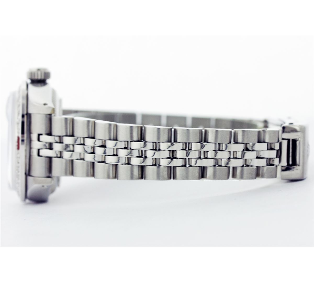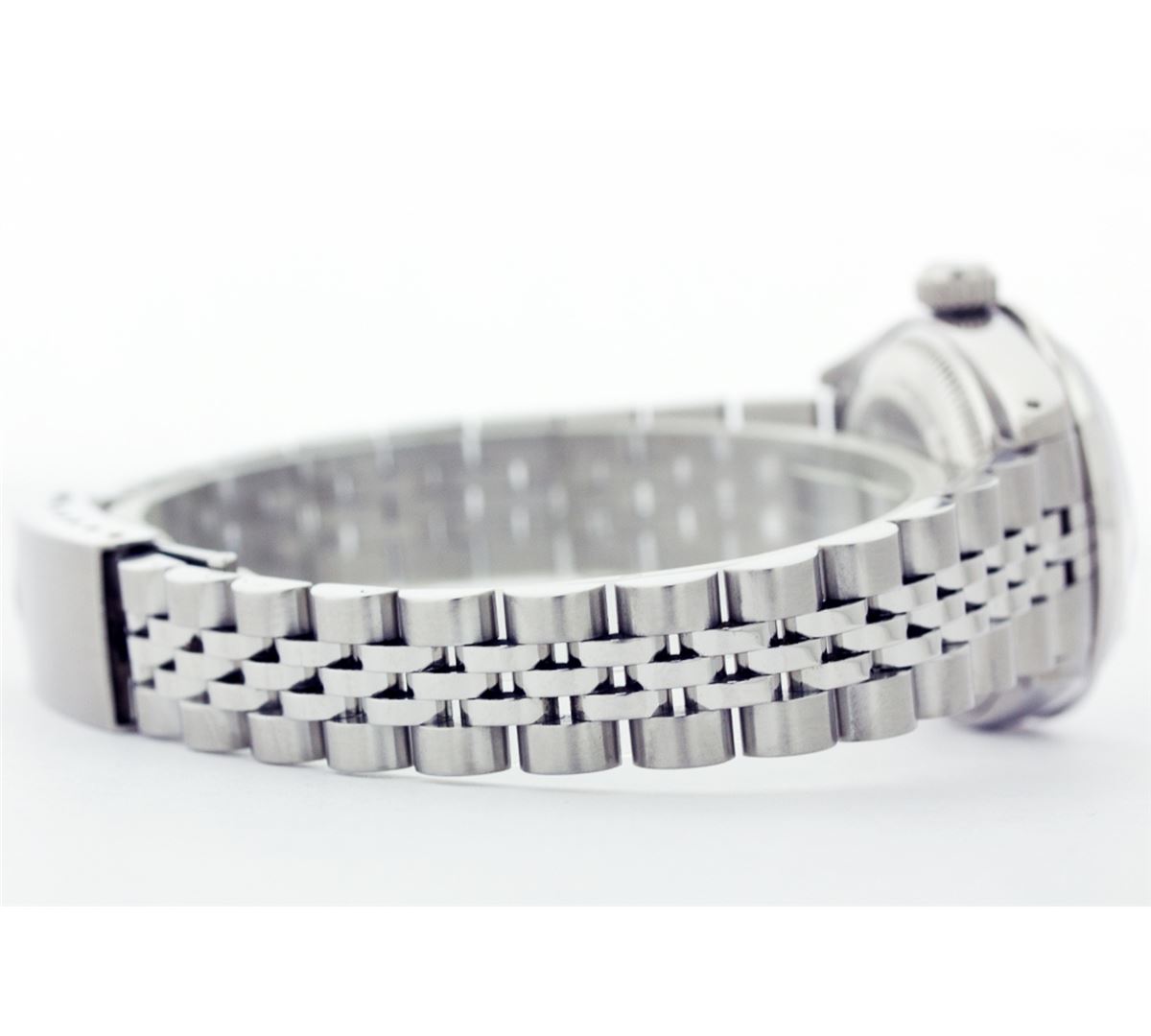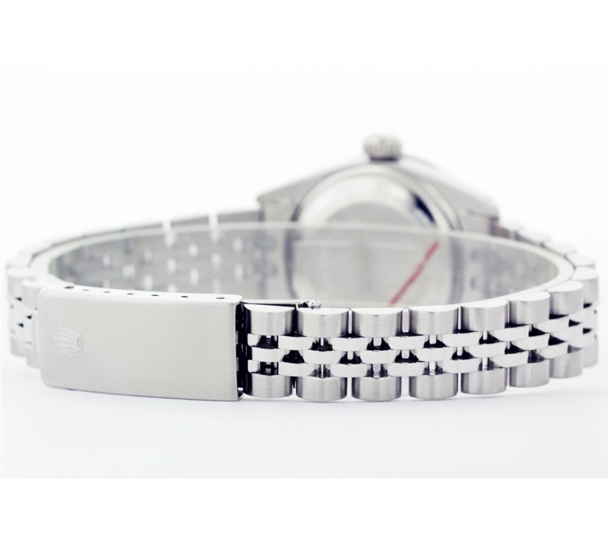 One Ladies Rolex Datejust Polished Bright with Satin Finish, Serviced & Electronically Tested, Stainless Steel Case:26mm, Stainless Steel Crown, Custom Bezel: 18K White Gold Ruby Beadset Diamond Bezel, Diamond Count: 28 Diamonds + 4 Rubies Total Weight .70 Carat, Clarity: SI-VS, Color: G to H. Custom Crystal: Synthetic Sapphire Cyclops Lens. Movement: Automatic Winding Movement Caliber 2030. Custom Dial: Black Dial with Diamond Hour Markers. Clarity: SI-VS, Color: G to H. Date Window: 3 O'Clock Position Date Display, Model: 6917 Condition: G-6 Extra Fine. Bracelet: Stainless Steel Jubilee Band. Non quickset. Bright Polish & Satin Finish. 5.5 Inch Length, Adjustable. Standard Clasp, With Rolex Logo.