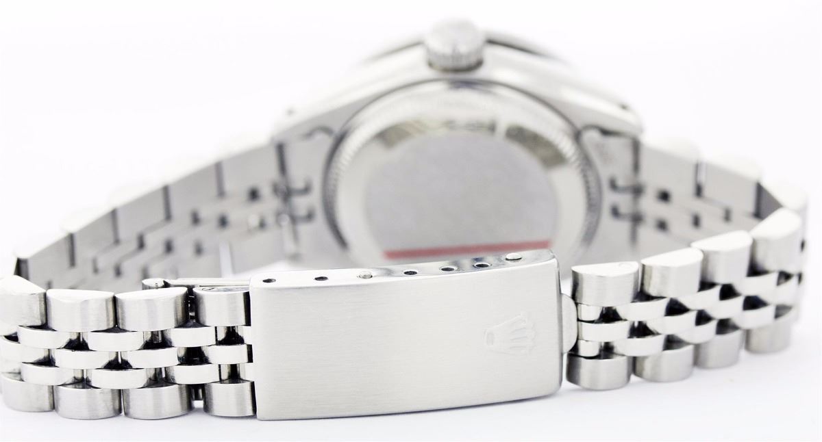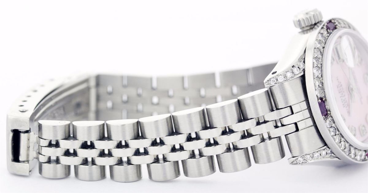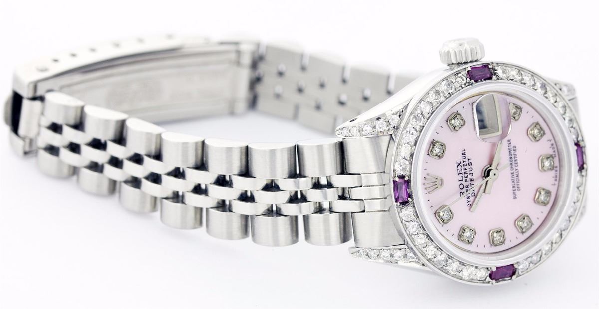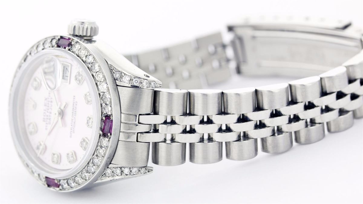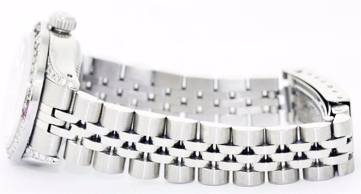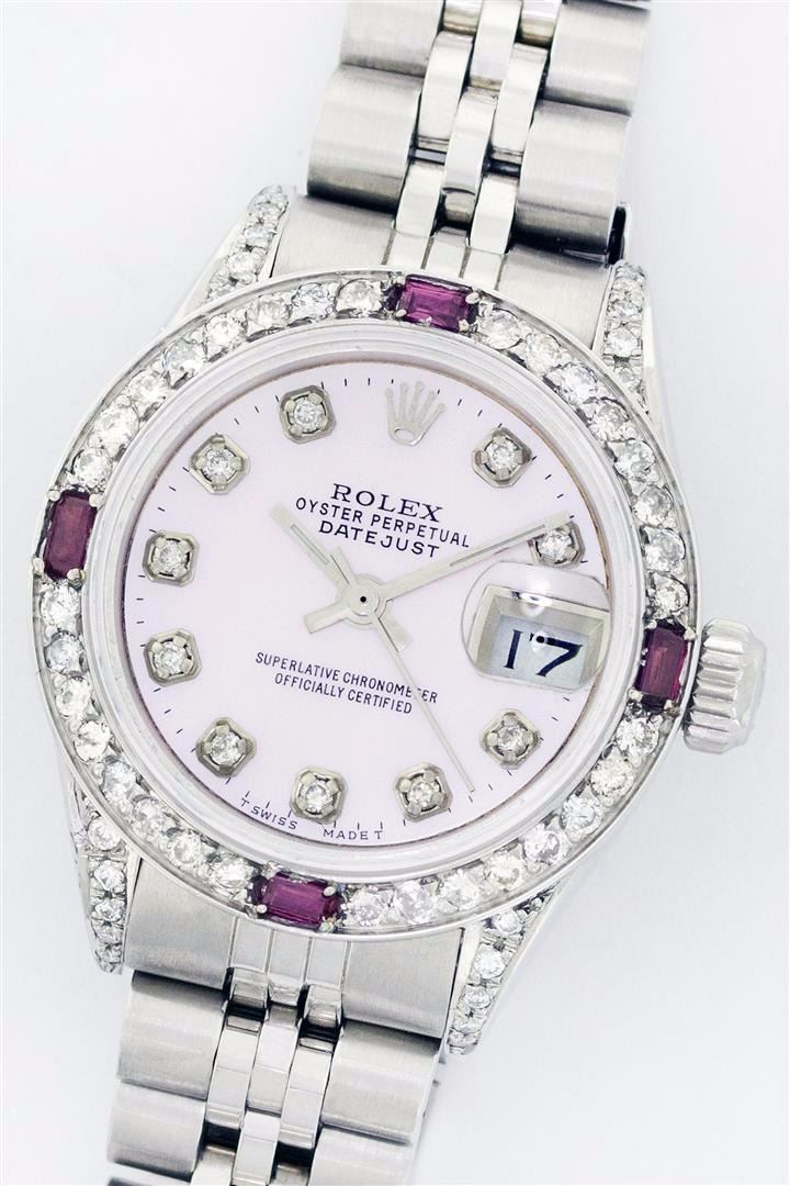 One Ladies Rolex Datejust Polished Bright with Satin Finish, Serviced & Electronically Tested, Stainless Steel Case With Diamond Lugs, Clarity: SI-VS, Color: G to H Case Size:26mm, Stainless Steel Crown, Custom Bezel: 18K White Gold Ruby Beadset Diamond Bezel, Diamond Count: 28 Diamonds + 4 Rubies Total Weight .70 Carat, Clarity: SI-VS, Color: G to H. Custom Crystal: Synthetic Sapphire Cyclops Lens. Movement: Automatic Winding Movement Caliber 2030. Custom Dial: Refinished Pink Mother Of Pearl With Diamond Hour Markers, Diamond Count: 10 Diamonds, Clarity: SI-VS, to H. Date Window: 3 O'Clock Position Date Display, Non Quickset, Model: 6917 Condition: G-6 Extra Fine. Bracelet: Stainless Steel Jubilee. Bright Polish & Satin Finish. 5.5 Inch Length, Adjustable. Standard Clasp, With Rolex Logo.