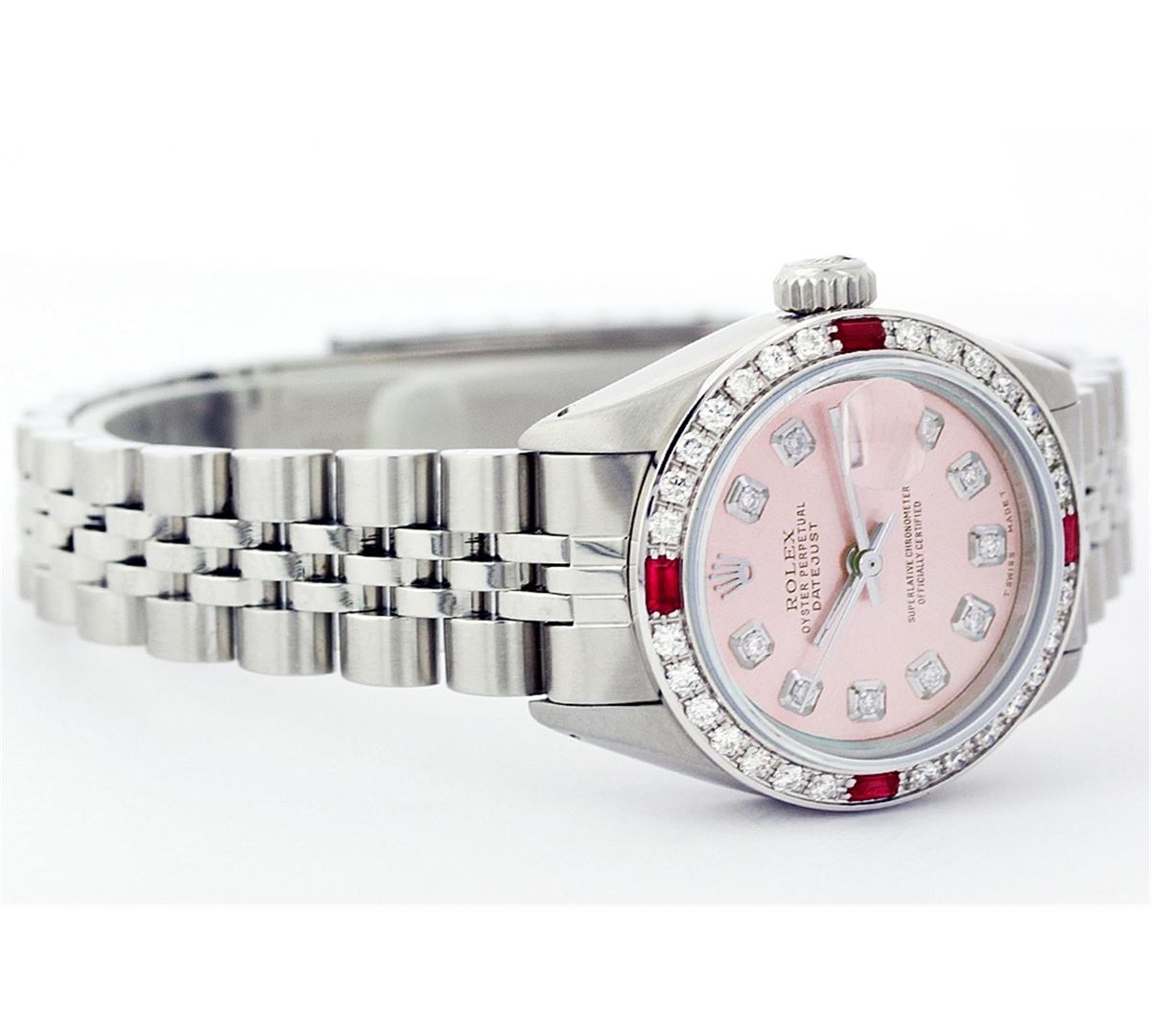 One Ladies Rolex Datejust Polished Bright with Satin Finish, Serviced & Electronically Tested, Stainless Steel Case:26mm, Stainless Steel Crown, Custom Bezel: 18K White Gold Ruby Beadset Diamond Bezel, Diamond Count: 28 Diamonds + 4 Rubies Total Weight .70 Carat, Clarity: SI-VS, Color: G to H. Custom Crystal: Synthetic Sapphire Cyclops Lens. Movement: Automatic Winding Movement Caliber 2030. Custom Dial: Salmon Diamond Dial, Diamond Count: 10 Diamonds In Dial, Clarity: SI-VS, Color: G to H. Date Window: 3 O'Clock Position Date Display, Non Quickset, Model: 6917 Condition: G-6 Extra Fine. Bracelet: Stainless Steel Jubilee Band. Bright Polish & Satin Finish. 5.5 Inch Length, Adjustable. Standard Clasp, With Rolex Logo.